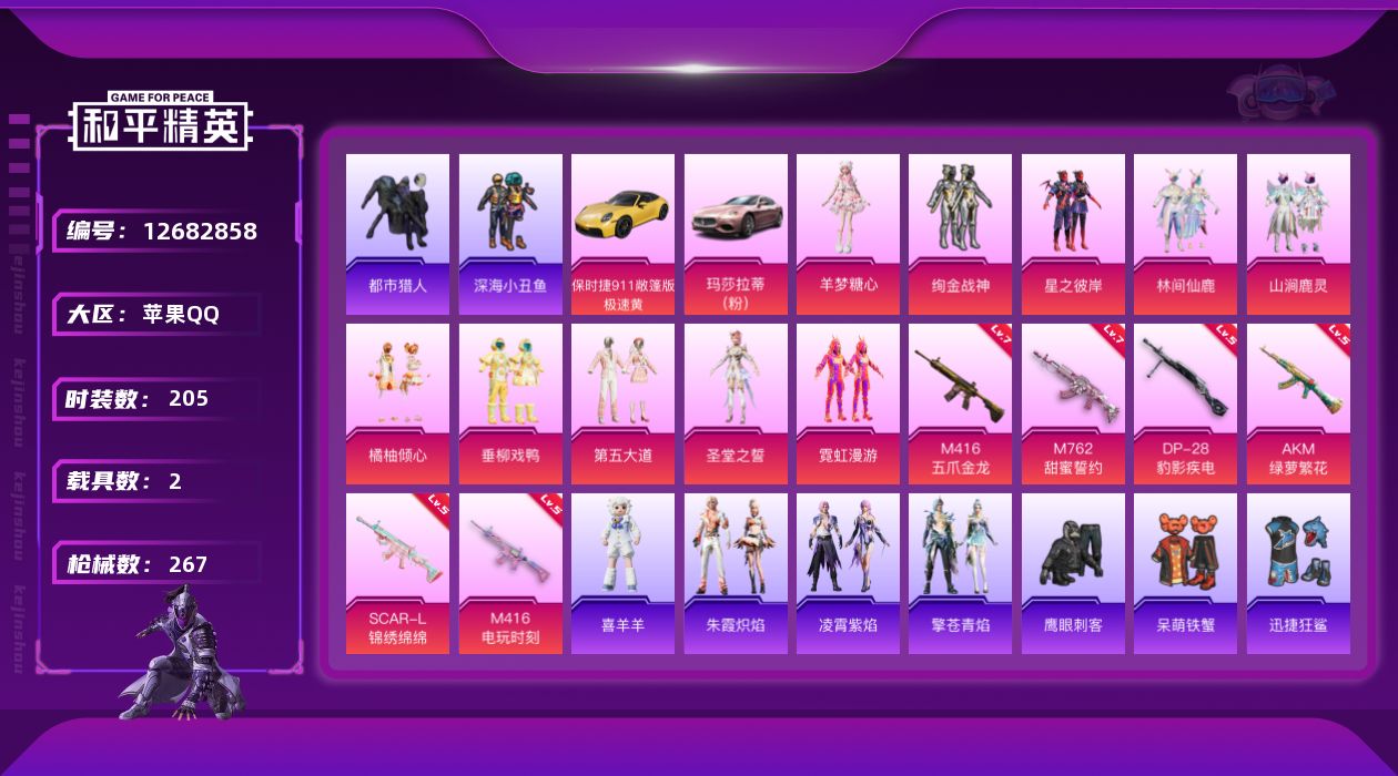 [12682858]【1140】苹果 手Q-10粉装-6特效枪-2载具-1粉色飞行器-89483热力值-18王牌印记-205套装-267枪皮 【热门品类】:绝对防御上衣,套装-浪漫天命,套装-都市猎人,套装-深海小丑鱼,套装-小丑鱼,角色-军刀雅典娜,套装-金羽特工,套装-星河浪客,套装-龟仙人,套装-粉红小猪 【粉色载具】:玛莎拉蒂Ghibli(粉),保时捷911 敞篷版(极速黄) 【粉色套装】:粉装-绚金战神,粉装-星之彼岸,粉装-林间仙鹿,粉装-山涧鹿灵,粉装-橘柚倾心,粉装-垂柳戏鸭,粉装-第五大道,角色-圣堂之誓,粉装-霓虹漫游,角色-羊梦糖心 【粉色枪皮等级】:AKM-绿萝繁花(五级),SCAR-L-锦绣绵绵(五级),M416-五爪金龙(七级),M416-电玩时刻(五级),M762-甜蜜誓约(七级),DP-28-豹影疾电(五级) 【粉色枪皮】:AKM-绿萝繁花,SCAR-L-锦绣绵绵,M416-五爪金龙,M416-电玩时刻,M762-甜蜜誓约,DP-28-豹影疾电 【粉色飞行器】:绮梦青鸾飞行器 【粉色降落伞】:深海曼妙降落伞,未来战士降落伞,古堡领主降落伞,银刃赛罗降落伞,王牌四分卫降落伞,林间仙鹿降落伞,洛神天依降落伞,流星咚咚降落伞,天之羽翼降落伞,碧影闪光降落伞,妙趣可丽降落伞,第五大道降落伞,绝色倾城降落伞,精灵梦叶罗丽降落伞,无垠阁降落伞 【稀有套装】:套装-龟仙人,角色-米开朗基罗,套装-朱霞炽焰,套装-凌霄紫焰,套装-擎苍青焰,玩偶服-喜羊羊 【稀有枪皮】:AKM-夜灯,AKM-奇异狩猎者,AKM-彩虹符号,AKM-影袭,AKM-星之信仰,AKM-星之彼岸,AKM-灼热熔岩,AKM-生命誓言,AKM-破晓战魂,AKM-缤纷海域,AKM-萌趣颜团子,AKM-虎虎生威,AKM-霓虹街区,AKM-龙的传人,M16A4-夜灯,M16A4-幻世战舞者,M16A4-甜心亚梦,M16A4-蓝色火焰,SCAR-L-凝视深渊,SCAR-L-夜灯,SCAR-L-炫彩节奏,SCAR-L-玉兔迎春,SCAR-L-王牌四分卫,SCAR-L-甜蜜誓约,SCAR-L-黄金龙骨,M416-夜灯,M416-滑板小狐,M416-糯团青竹,M416-红色方程式,M416-绯红前夜,M416-黄金龙骨,GROZA-异彩先驱,GROZA-彩虹符号,GROZA-影袭,GROZA-懵萌河马,GROZA