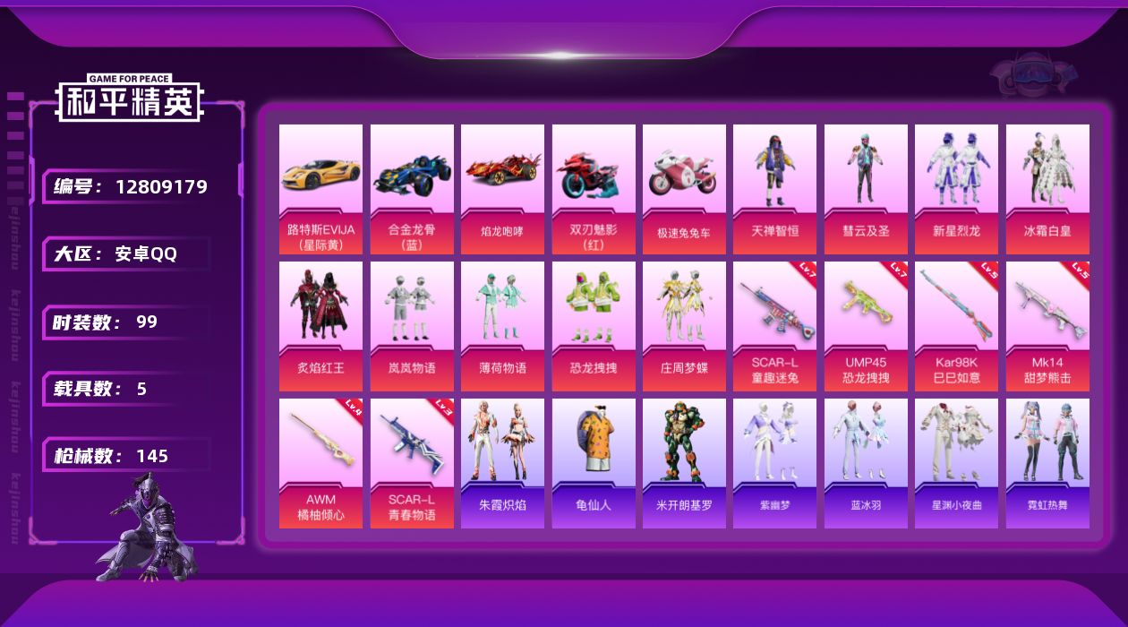 [12809179]【1195】安卓 手Q-9粉装-6特效枪-5载具-2粉色飞行器-56608热力值-3王牌印记-99套装-145枪皮