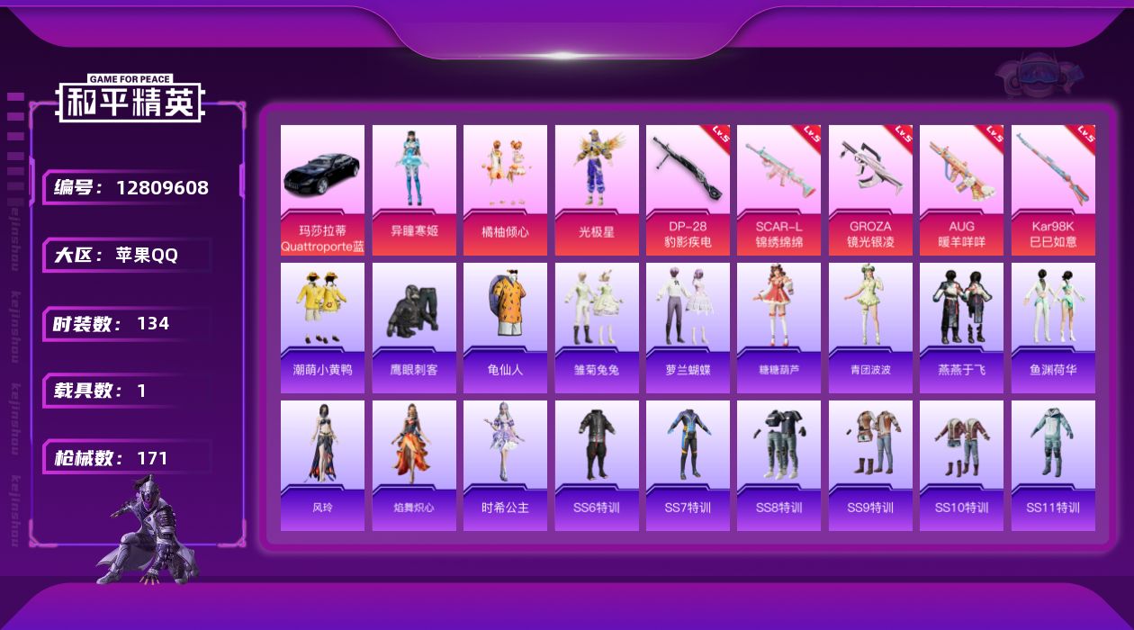 [12809608]【1199】苹果 手Q-4粉装-5特效枪-1载具-3粉色飞行器-52176热力值-10王牌印记-134套装-171枪皮