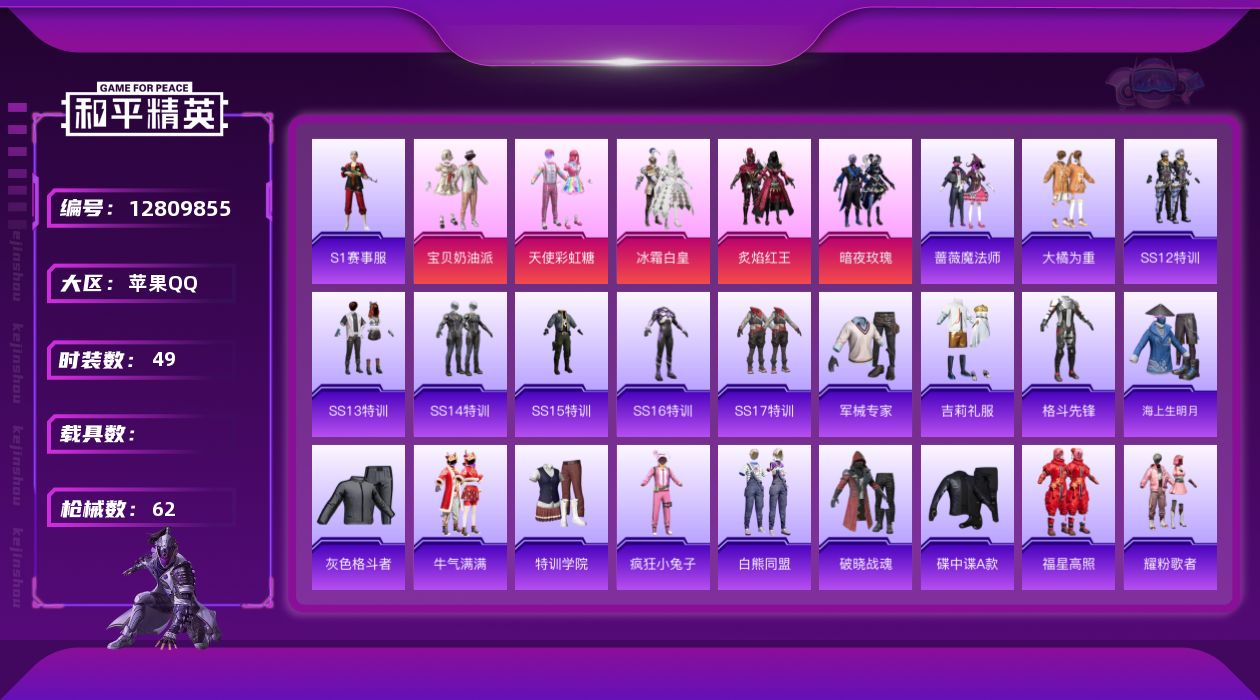 [12809855]【1204】苹果 手Q-5粉装-0特效枪-0载具-1粉色飞行器-20015热力值-1王牌印记-49套装-62枪皮