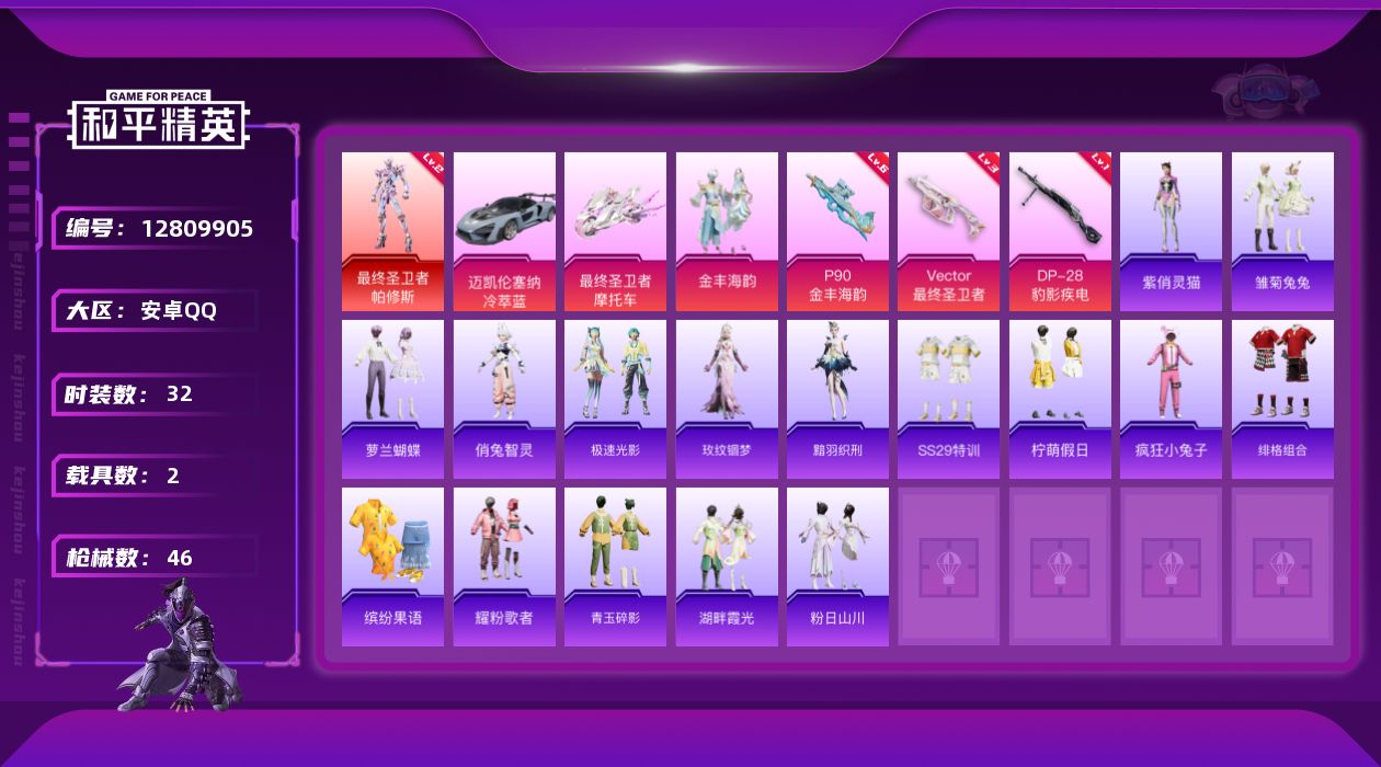 [12809905]【1205】安卓 手Q-1神装-1粉装-3特效枪-2载具-1粉色飞行器-18058热力值-1王牌印记-32套装-46枪皮 【红色神装等级】:最终圣卫者-帕修斯(二级) 【红色角色神装】:最终圣卫者-帕修斯 【粉色载具】:迈凯伦塞纳(冷萃蓝),最终圣卫者摩托车 【粉色套装】:粉装-金丰海韵 【粉色枪皮等级】:Vector-最终圣卫者(三级),P90-金丰海韵(六级),DP-28-豹影疾电(一级) 【粉色枪皮】:Vector-最终圣卫者,P90-金丰海韵,DP-28-豹影疾电 【粉色飞行器】:终晖之翼飞行器 【粉色降落伞】:金丰海韵降落伞,英伦信使降落伞,月影灵韵降落伞,幻彩电音降落伞,双重狂想降落伞,最终圣卫者降落伞,冷漠罗丽降落伞,异瞳寒姬降落伞 【稀有套装】:套装-雏菊兔兔,套装-萝兰蝴蝶,角色-俏兔智灵,套装-极速光影,角色-玫纹锢梦,角色-黯羽织刑,角色-紫俏灵猫 【稀有枪皮】:M16A4-最终圣卫者,SCAR-L-炫彩节奏,AUG-耀粉歌者,QBZ-彩虹符号,M762-天降萌叽,AC-VAL-天降萌叽,UZI-天降萌叽,汤姆逊-天降萌叽,野牛-最终圣卫者,Kar98k-最终圣卫者,M200-爆裂游戏,S686-千金淑猫,M249-彩虹符号,M249-糯团青竹,DP-28-彩虹符号,MG3-幻世战舞者,MG3-第五大道,R45-幻彩电音 【其他套装】:套装-SS29特训,套装-柠萌假日,套装-疯狂小兔子,套装-绯格组合,套装-缤纷果语,套装-耀粉歌者,套装-青玉碎影,套装-湖畔霞光,套装-粉日山川 【营地ID】:1029914882