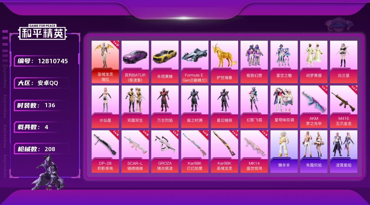 - [12579658]安卓 手Q-3粉装-0特效枪-1载具-3粉色飞行器-42236热力值-2王牌印记-96套装-122枪皮 【粉色载具】:双人摩托-梦幻火箭 【粉色套装】:粉装-新星烈龙,粉装-王牌四分卫,粉装-橘柚倾心 【粉色飞行器】:梦幻火箭飞行器,古堡领主飞行器,星夜魔法师飞行翼 【粉色降落伞】:梦幻火箭降落伞,四圣焕新降落伞,心之恋语降落伞,阿狸红降落伞,香水柠檬降落伞,星之彼岸降落伞,天之羽翼降落伞,环太平洋降落伞,垂柳戏鸭降落伞 【稀有枪皮】:AKM-玉龙,AKM-生命誓言,AKM-破晓战魂,AKM-虎虎生威,AKM-霓虹街区,M16A4-九霄,M16A4-甜心亚梦,M16A4-红色方程式,SCAR-L-凝视深渊,SCAR-L-暗夜玫瑰,SCAR-L-玉兔迎春,SCAR-L-甜蜜誓约,SCAR-L-红色方程式,SCAR-L-金风玉露,M416-月影鸳鸯,M416-红色方程式,M416-绯红前夜,M416-蓝色火焰,GROZA-异彩先驱,AUG-PEC最牛战神,AUG-耀粉歌者,QBZ-原初圣火,QBZ-神秘黑猫,QBZ-赛罗,QBZ-飞驰魅影,M762-深海曼妙,M762-牛气冲天,M762-瑞龙福将,Mk47-天之羽翼,G36C-暗夜玫瑰,AC-VAL-甜心亚梦,蜜獾-娇憨猪猪,UZI-古堡领主,UZI-娇憨猪猪,UZI-炫彩节奏,UZI-红色方程式,UZI-金风玉露,UMP45-夜灯,UMP45-灵符少年,Vector-彩虹符号,Vector-暗夜玫瑰,Vector-生命誓言,汤姆逊-勇闯险境,汤姆逊-异彩先驱,汤姆逊-耀粉歌者,野牛-电玩视界,MP5K-异彩先驱,MP5K-焰龙焚天,P90-飞驰魅影,Kar98K-勇闯险境,Kar98K-梦幻火箭,Kar98K-红色方程式,Kar98K-飞驰魅影,Kar98K-马卡龙,M24-百合蜜语,SKS-勇闯险境,SKS-夜灯,SKS-青丘仙客,VSS-繁花小夜曲,Mini14-原初圣火,Mini14-异彩先驱,Mini14-春暖花开,Mini14-梦幻火箭,Mini14-炫彩节奏,Mini14-甜心娃娃,Mini14-耀粉歌者,Mini14-马卡龙,Win94-瑞龙福将,SLR-四圣焕新,SLR-娇憨猪猪,S686-奇异狩猎者,S686-浪客战士,S686-生命誓言,S686-红色方程式,S1897-勇闯险境,S1897-炫