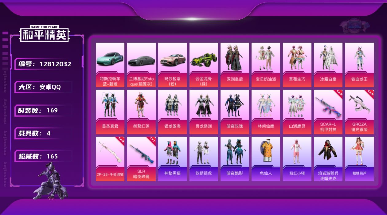 [12812032]【1214】安卓 手Q-13粉装-4特效枪-4载具-2粉色飞行器-66844热力值-6王牌印记-169套装-165枪皮 【热门品类】:套装-SS1特训,套装-龟仙人,套装-粉红小猪,熔岩游骑兵面罩,熔岩游骑兵连帽夹克 【粉色载具】:特斯拉Roadster(水滴蓝),兰博基尼Estoque(银翼灰),玛莎拉蒂Ghibli(粉),合金龙骨(绿),空客H135-蔚蓝之翼 【粉色套装】:粉装-深渊皇后,粉装-宝贝奶油派,粉装-草莓生巧,粉装-冰霜白皇,粉装-铁血龙王,粉装-显圣真君,粉装-桀骜红莲,粉装-银龙傲海,粉装-骨龙祭渊,粉装-暗夜玫瑰,粉装-林间仙鹿,粉装-山涧鹿灵 【粉色枪皮等级】:SCAR-L-机甲封神(五级),GROZA-镜光银凌(四级),SLR-暗夜玫瑰(一级),DP-28-千金淑猫(四级) 【粉色枪皮】:SCAR-L-机甲封神,GROZA-镜光银凌,SLR-暗夜玫瑰,DP-28-千金淑猫 【粉色飞行器】:深海曼妙飞行器,镜光幻境飞行翼 【粉色降落伞】:深海曼妙降落伞,春暖花开降落伞,花间之火降落伞,夏日绵绵冰降落伞,焰龙焚天降落伞,暗夜玫瑰降落伞,林间仙鹿降落伞,千面幻镜降落伞,飒粉甜心降落伞 【稀有套装】:套装-龟仙人,套装-糖糖葫芦,套装-青团波波 【稀有枪皮】:AKM-夜灯,AKM-奇异狩猎者,AKM-彩虹符号,AKM-破晓战魂,AKM-萌趣颜团子,AKM-霓虹街区,M16A4-凝视深渊,M16A4-幻世战舞者,M16A4-生命誓言,M16A4-千金淑猫,SCAR-L-夏日绵绵冰,SCAR-L-暗夜玫瑰,SCAR-L-炫彩节奏,SCAR-L-玉兔迎春,SCAR-L-生命誓言,M416-糯团青竹,M416-红色方程式,M416-蓝色火焰,GROZA-懵萌河马,GROZA-林间仙鹿,GROZA-生命誓言,GROZA-田园牧歌,GROZA-黑色刀锋,AUG-焰龙焚天,QBZ-彩虹符号,QBZ-电玩视界,M762-天降萌叽,M762-奇异狩猎者,M762-深海曼妙,M762-牛气冲天,M762-瑞龙福将,M762-镭射皇者,Mk47-林间仙鹿,Mk47-百万伏特,G36C-懵萌河马,G36C-时空追击者,G36C-暗夜玫瑰,G36C-花间之火,AC-VAL-天降萌叽,蜜獾-垂柳戏鸭,蜜獾-天降萌叽,蜜獾-娇憨猪猪,UZI-众神之王,UZI-娇憨猪猪,UZ