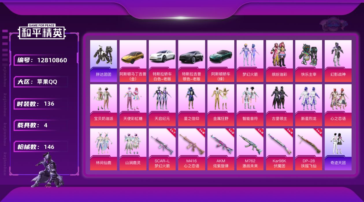 [12810860]【1216】苹果 手Q-15粉装-6特效枪-4载具-4粉色飞行器-67098热力值-1王牌印记-136套装-146枪皮 【热门品类】:粉装-梦幻火箭,粉装-缤纷油彩,套装-胖达团团,套装-忍者信条 【粉色载具】:特斯拉Model 3(珍珠白),特斯拉Model X(冷光银),阿斯顿马丁DBS(绿),阿斯顿马丁DBX(金) 【粉色套装】:粉装-快乐主宰,粉装-幻影战神,粉装-宝贝奶油派,粉装-天使彩虹糖,粉装-梦幻火箭,粉装-天启纪元,粉装-星之信仰,粉装-金属狂野,粉装-智能音符,粉装-缤纷油彩,粉装-古堡领主,粉装-新星烈龙,粉装-心之恋语,粉装-林间仙鹿,粉装-山涧鹿灵 【粉色枪皮等级】:AKM-炫紫旋律(五级),SCAR-L-梦幻火箭(七级),M416-心之恋语(六级),M762-激战未来(四级),Kar98K-伏魔团(四级),DP-28-扶摇飞仙(三级) 【粉色枪皮】:AKM-炫紫旋律,SCAR-L-梦幻火箭,M416-心之恋语,M762-激战未来,Kar98K-伏魔团,DP-28-扶摇飞仙 【粉色飞行器】:梦幻火箭飞行器,炫紫旋律飞行器,古堡领主飞行器,伏魔团飞行器 【粉色降落伞】:快乐主宰降落伞,幻影战神降落伞,精灵迷巫降落伞,梦幻火箭降落伞,天启纪元降落伞,星之信仰降落伞,炫紫旋律降落伞,古堡领主降落伞,伏魔团降落伞,四圣焕新降落伞,心之恋语降落伞,烈焰拳霸降落伞,林间仙鹿降落伞,绯穹魔姬降落伞 【稀有枪皮】:AKM-天启纪元,AKM-彩虹符号,AKM-折纸暴龙,AKM-星之信仰,AKM-虎虎生威,AKM-霓虹街区,M16A4-幻世战舞者,M16A4-快乐主宰,M16A4-机械英豪,M16A4-蓝色火焰,M16A4-魔法学院,SCAR-L-暗夜玫瑰,SCAR-L-炫彩节奏,SCAR-L-玉兔迎春,SCAR-L-繁花小夜曲,M416-仓鼠灰灰,M416-快乐主宰,M416-绿野极光,M416-蓝色火焰,M416-魔法学院,GROZA-暗夜武装,GROZA-治愈之星,GROZA-黑色刀锋,AUG-幻影战神,AUG-魔法学院,QBZ-原初圣火,QBZ-彩虹符号,M762-快乐主宰,M762-折纸暴龙,M762-拳皇97,M762-牛气冲天,M762-瑞龙福将,M762-甜心宝贝,M762-镭射皇者,Mk47-林间仙鹿,G36C-时空追击者,UZI-古堡领主