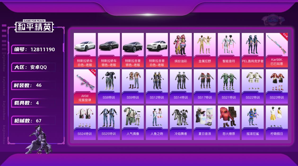 [12811190]【1220】安卓 手Q-4粉装-2特效枪-4载具-2粉色飞行器-25965热力值-1王牌印记-46套装-67枪皮 【热门品类】:粉装-缤纷油彩 【粉色载具】:特斯拉Model 3(珍珠白),特斯拉Model 3(冷光银),特斯拉Model X(冷光银),特斯拉Model X(珍珠白) 【粉色套装】:粉装-金属狂野,粉装-智能音符,粉装-缤纷油彩,粉装-PEL轰鸣竞梦者 【粉色枪皮等级】:AKM-炫紫旋律(四级),Kar98K-巳巳如意(五级) 【粉色枪皮】:AKM-炫紫旋律,Kar98K-巳巳如意 【粉色飞行器】:深海曼妙飞行器,炫紫旋律飞行器 【粉色降落伞】:深海曼妙降落伞,炫紫旋律降落伞,PEL轰鸣竞梦者降落伞,幻影飞狐降落伞,星穹咏叹调降落伞 【稀有枪皮】:AKM-PEL轰鸣竞梦者,AKM-夜灯,AKM-破晓战魂,AKM-虎虎生威,AKM-龙的传人,SCAR-L-玉兔迎春,SCAR-L-红色方程式,M416-夜灯,M416-糯团青竹,M416-蓝色火焰,AUG-天降萌叽,AUG-耀粉歌者,M762-天降萌叽,M762-深海曼妙,M762-牛气冲天,AC-VAL-天降萌叽,蜜獾-天降萌叽,UZI-众神之王,UMP45-蓝色火焰,Vector-PEL轰鸣竞梦者,Vector-彩虹符号,Vector-王子的夏天,Vector-生命誓言,汤姆逊-耀粉歌者,MP5K-众神之王,P90-巳巳如意,Kar98K-彩虹符号,Kar98K-深海曼妙,Kar98K-红色方程式,M24-众神之王,SKS-炫彩节奏,Mini14-炫彩节奏,Mini14-耀粉歌者,SLR-众神之王,SLR-彩虹符号,S686-深海曼妙,S686-巳巳如意,S12K-破晓战魂,S12K-PEL轰鸣竞梦者,DBS-第五大道,M249-破晓战魂,破片手榴弹-巳巳如意 【其他套装】:套装-SS8特训,套装-SS9特训,套装-SS12特训,套装-SS14特训,套装-SS17特训,套装-SS21特训,套装-SS22特训,套装-SS23特训,套装-SS24特训,套装-SS25特训,套装-人气偶像,套装-人鱼之吻,套装-冷焰舞者,套装-夏日音浪,套装-怒火燎原,套装-摇滚狂鲨,套装-柠萌假日,套装-格斗先锋,套装-牛气冲天,套装-牛气满满,套装-特战装甲,套装-特殊使命,套装-王牌教练,套装-竞技名士,套装-缤纷果