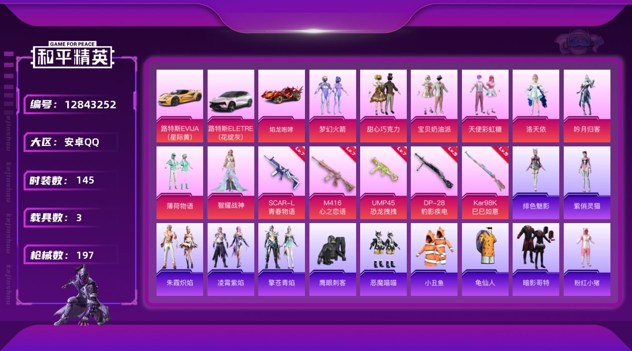 [12843252]【1225】安卓 手Q-8粉装-5特效枪-3载具-3粉色飞行器-66797热力值-9王牌印记-145套装-197枪皮 【热门品类】:粉装-梦幻火箭,套装-小丑鱼,套装-龟仙人,套装-暗影哥特,套装-粉红小猪 【粉色载具】:路特斯EVIJA(星际黄),路特斯ELETRE(花绽灰),焰龙咆哮 【粉色套装】:粉装-甜心巧克力,粉装-宝贝奶油派,粉装-天使彩虹糖,粉装-梦幻火箭,角色-洛天依,粉装-吟月归客,粉装-薄荷物语,角色-智耀战神 【粉色枪皮等级】:SCAR-L-青春物语(七级),M416-心之恋语(七级),UMP45-恐龙拽拽(七级),Kar98K-巳巳如意(五级),DP-28-豹影疾电(五级) 【粉色枪皮】:SCAR-L-青春物语,M416-心之恋语,UMP45-恐龙拽拽,Kar98K-巳巳如意,DP-28-豹影疾电 【粉色飞行器】:梦幻火箭飞行器,齐天大圣飞行器,星夜魔法师飞行翼 【粉色降落伞】:甜心宝贝降落伞,暗夜玫瑰降落伞,洛神天依降落伞,蓝莓炮弹降落伞,碧影闪光降落伞,恐龙拽拽降落伞,橘柚倾心降落伞,垂柳戏鸭降落伞,鬼刀降落伞,幻彩电音降落伞,异瞳寒姬降落伞 【稀有套装】:套装-龟仙人,套装-巳巳如意,套装-雏菊兔兔,套装-萝兰蝴蝶,套装-燕燕于飞,套装-鱼渊荷华,套装-紫幽梦,套装-蓝冰羽,套装-朱霞炽焰,套装-凌霄紫焰,套装-擎苍青焰,角色-绯色魅影,角色-紫俏灵猫 【稀有枪皮】:AKM-冰凉西瓜,AKM-奇异狩猎者,AKM-恐龙拽拽,AKM-萌趣颜团子,AKM-虎虎生威,AKM-霓虹街区,M16A4-幻世战舞者,M16A4-甜心亚梦,M16A4-红色方程式,SCAR-L-夜灯,SCAR-L-暗夜玫瑰,SCAR-L-炫彩节奏,SCAR-L-玉兔迎春,SCAR-L-红色方程式,M416-糯团青竹,M416-红色方程式,M416-葫芦兄弟,GROZA-彩虹符号,GROZA-恐龙拽拽,GROZA-懵萌河马,GROZA-田园牧歌,GROZA-黑色刀锋,AUG-天降萌叽,AUG-耀粉歌者,QBZ-彩虹符号,QBZ-洛神天依,QBZ-飞驰魅影,M762-天降萌叽,M762-奇异狩猎者,M762-暗夜鎏金,M762-烈焰拳霸,M762-瑞龙福将,M762-甜心宝贝,Mk47-妙红点点,G36C-懵萌河马,G36C-时空追击者,G36C-暗夜玫瑰,AC-VAL-天