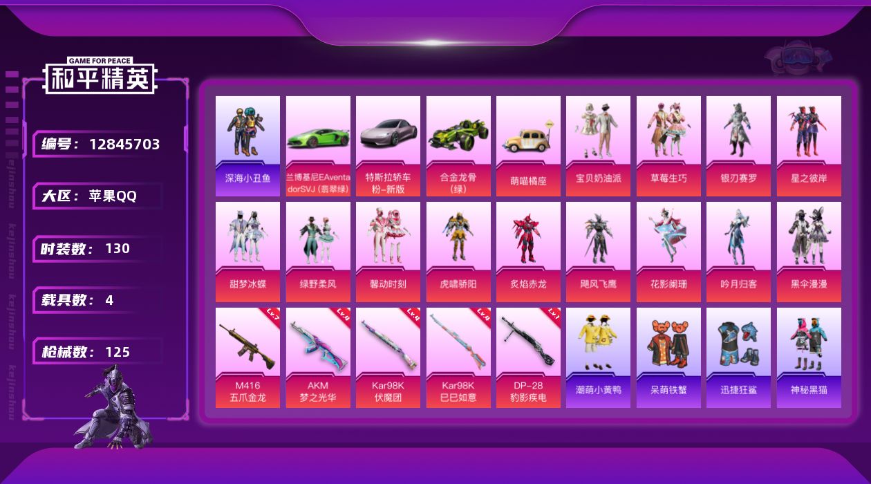 [12845703]【1236】苹果 手Q-13粉装-5特效枪-4载具-2粉色飞行器-53969热力值-2王牌印记-130套装-125枪皮