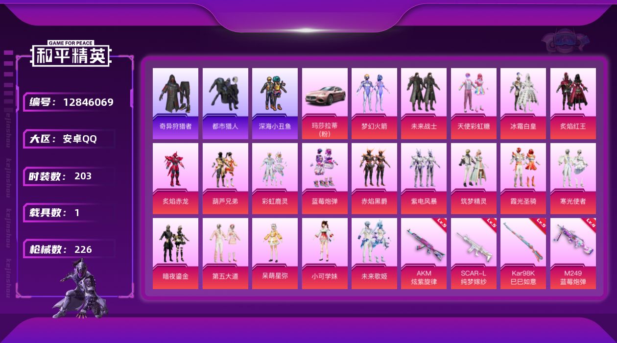 [12846069]【1240】安卓 手Q-19粉装-7特效枪-1载具-2粉色飞行器-82172热力值-10王牌印记-203套装-226枪皮 【热门品类】:粉装-梦幻火箭,套装-浪漫天命,套装-都市猎人,套装-深海小丑鱼,套装-小丑鱼,套装-奇异狩猎者,套装-龟仙人,套装-暗影哥特,套装-粉红小猪 【粉色载具】:玛莎拉蒂Ghibli(粉) 【粉色套装】:粉装-未来战士,粉装-天使彩虹糖,粉装-梦幻火箭,粉装-冰霜白皇,粉装-炙焰红王,粉装-炙焰赤龙,粉装-葫芦兄弟,粉装-彩虹鹿灵,粉装-蓝莓炮弹,粉装-赤焰黑爵,粉装-紫电风暴,粉装-筑梦精灵,粉装-霞光圣骑,粉装-寒光使者,粉装-暗夜鎏金,粉装-第五大道,角色-呆萌星弥,角色-小可学妹,粉装-未来歌姬 【粉色枪皮等级】:AKM-炫紫旋律(五级),SCAR-L-纯梦嫁纱(五级),Kar98K-巳巳如意(五级),M417-第五大道(三级),M249-蓝莓炮弹(四级),MG3-洛神天依(四级),平底锅-仲夏莫吉托(三级) 【粉色枪皮】:AKM-炫紫旋律,SCAR-L-纯梦嫁纱,Kar98K-巳巳如意,M417-第五大道,M249-蓝莓炮弹,MG3-洛神天依,平底锅-仲夏莫吉托 【粉色飞行器】:梦幻火箭飞行器,风花雪月飞行器 【粉色降落伞】:快乐主宰降落伞,幻影战神降落伞,百万伏特降落伞,未来战士降落伞,甜心宝贝降落伞,梦幻火箭降落伞,烈焰拳霸降落伞,暗夜玫瑰降落伞,洛神天依降落伞,海渊国主降落伞,蓝莓炮弹降落伞,碧影闪光降落伞,橘柚倾心降落伞,筑梦精灵降落伞,炙焰牛王降落伞,圣光天使降落伞,妙趣可丽降落伞,暗夜鎏金降落伞,第五大道降落伞,飒粉甜心降落伞 【稀有套装】:套装-龟仙人,套装-巳巳如意 【稀有枪皮】:AKM-冰凉西瓜,AKM-彩虹符号,AKM-影袭,AKM-海渊国主,AKM-灼热熔岩,AKM-破晓战魂,AKM-萌趣颜团子,AKM-虎虎生威,AKM-霓虹街区,AKM-龙的传人,M16A4-幻世战舞者,M16A4-快乐主宰,M16A4-甜心亚梦,M16A4-红色方程式,M16A4-蓝色火焰,SCAR-L-夜灯,SCAR-L-炫彩节奏,SCAR-L-玉兔迎春,SCAR-L-红色方程式,SCAR-L-黄金龙骨,M416-动感兔斯基,M416-夜灯,M416-彩虹嘻嘻猴,M416-快乐主宰,M416-糯团青竹,M416-红色方程式,M41