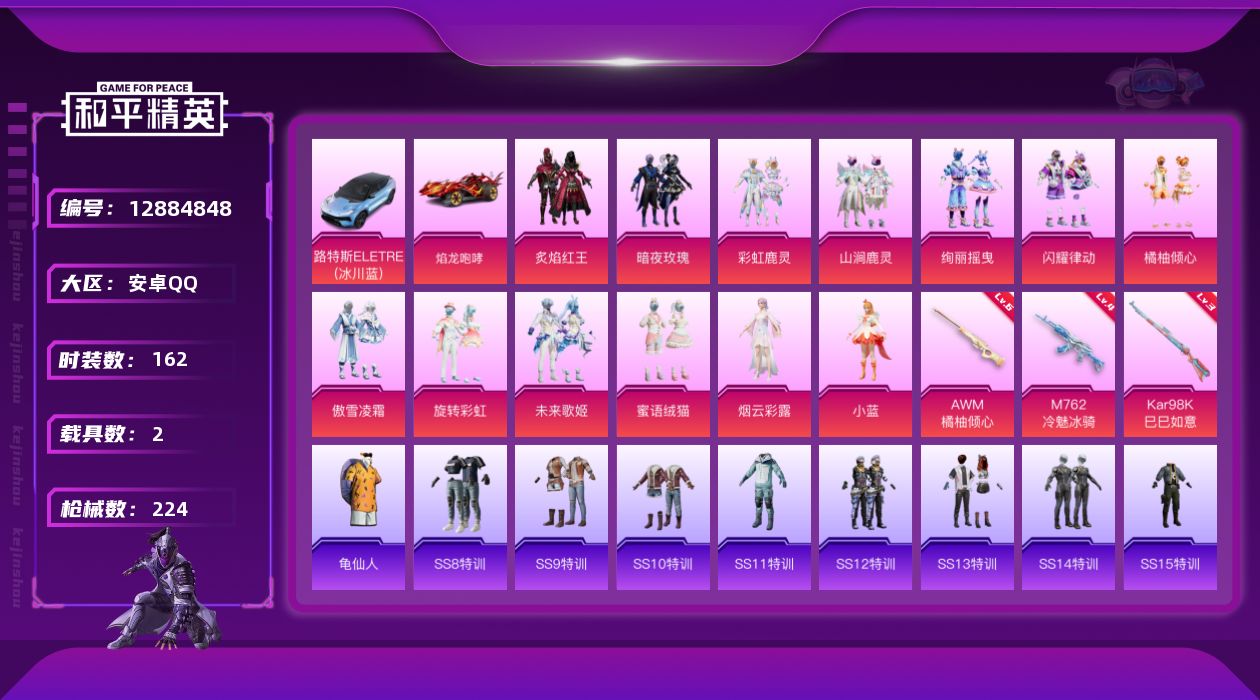 [12884848]【1358】安卓 手Q-13粉装-3特效枪-2载具-3粉色飞行器-80497热力值-9王牌印记-162套装-224枪皮 【热门品类】:套装-龟仙人 【粉色载具】:路特斯ELETRE(冰川蓝),焰龙咆哮 【粉色套装】:粉装-炙焰红王,粉装-暗夜玫瑰,粉装-彩虹鹿灵,粉装-山涧鹿灵,粉装-绚丽摇曳,粉装-闪耀律动,粉装-橘柚倾心,粉装-傲雪凌霜,粉装-旋转彩虹,粉装-未来歌姬,粉装-蜜语绒猫,角色-烟云彩露,角色-小蓝 【粉色枪皮等级】:M762-冷魅冰骑(四级),Kar98K-巳巳如意(三级),AWM-橘柚倾心(六级) 【粉色枪皮】:M762-冷魅冰骑,Kar98K-巳巳如意,AWM-橘柚倾心 【粉色飞行器】:星夜魔法师飞行翼,萌物绒绒飞行器,幻海精灵飞行器 【粉色降落伞】:甜心宝贝降落伞,神秘黑猫降落伞,夏日绵绵冰降落伞,星之彼岸降落伞,暗夜玫瑰降落伞,林间仙鹿降落伞,恐龙拽拽降落伞,幻梦音符降落伞,橘柚倾心降落伞,筑梦精灵降落伞,环太平洋降落伞,垂柳戏鸭降落伞,暗夜鎏金降落伞,天星战神降落伞,莲影清波降落伞,江南烟雨降落伞,精灵梦叶罗丽降落伞,墨龙九天降落伞,鸢尾晶梦降落伞,创世·救赎降落伞,守护天翼降落伞 【稀有套装】:套装-龟仙人 【稀有枪皮】:AKM-春暖花开,AKM-破晓战魂,AKM-筑梦精灵,AKM-萌趣颜团子,AKM-虎虎生威,AKM-锦绣火鲤,AKM-龙的传人,M16A4-幻世战舞者,M16A4-甜心亚梦,M16A4-红色方程式,SCAR-L-炫彩节奏,SCAR-L-玉兔迎春,SCAR-L-碧影闪光,SCAR-L-红色方程式,SCAR-L-青丘仙客,M416-夜灯,M416-糯团青竹,M416-紫翼圣骑,M416-红色方程式,M416-蓝色火焰,GROZA-彩虹符号,GROZA-恐龙拽拽,GROZA-春暖花开,GROZA-林间仙鹿,GROZA-治愈之星,GROZA-田园牧歌,GROZA-紫翼圣骑,AUG-幻梦音符,AUG-炫光贝贝,AUG-耀粉歌者,AUG-青春冒险家,QBZ-彩虹符号,QBZ-飞驰魅影,M762-橘柚倾心,M762-牛气冲天,M762-瑞龙福将,M762-萌物绒绒,Mk47-妙红点点,Mk47-林间仙鹿,Mk47-炫光之旅,Mk47-青春冒险家,AC-VAL-天降萌叽,AC-VAL-快闪甜心,AC-VAL-甜心亚梦,AC-VAL-