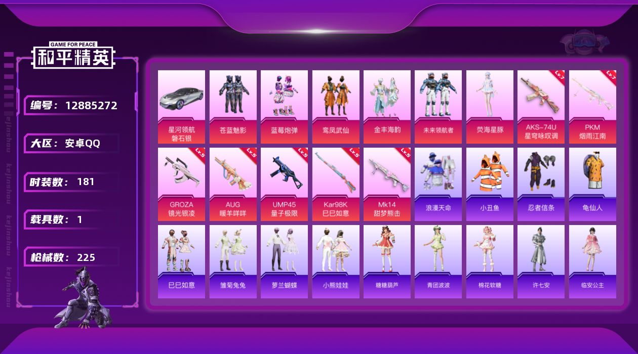 [12885272]【1360】安卓 手Q-6粉装-7特效枪-1载具-2粉色飞行器-73594热力值-11王牌印记-181套装-225枪皮 【热门品类】:套装-浪漫天命,套装-小丑鱼,套装-忍者信条,套装-龟仙人 【粉色载具】:星河领航(磐石银) 【粉色套装】:粉装-苍蓝魅影,粉装-蓝莓炮弹,粉装-鸾凤武仙,粉装-金丰海韵,粉装-未来领航者,角色-荧海星豚 【粉色枪皮等级】:GROZA-镜光银凌(五级),AUG-暖羊咩咩(五级),UMP45-量子极限(五级),AKS-74U-星穹咏叹调(七级),Kar98K-巳巳如意(五级),Mk14-甜梦熊击(五级),PKM-江南烟雨(七级) 【粉色枪皮】:GROZA-镜光银凌,AUG-暖羊咩咩,UMP45-量子极限,AKS-74U-星穹咏叹调,Kar98K-巳巳如意,Mk14-甜梦熊击,PKM-江南烟雨 【粉色飞行器】:青春物语飞行器,终晖之翼飞行器 【粉色降落伞】:锦绣火鲤降落伞,夏日绵绵冰降落伞,香水柠檬降落伞,星之彼岸降落伞,烈焰拳霸降落伞,风花雪月降落伞,碧影闪光降落伞,垂柳戏鸭降落伞,飒粉甜心降落伞,江南烟雨降落伞,临安公主降落伞,雪月幻音降落伞,智耀战神降落伞,星穹咏叹调降落伞 【稀有套装】:套装-龟仙人,套装-巳巳如意,套装-雏菊兔兔,套装-萝兰蝴蝶,套装-小熊娃娃,套装-糖糖葫芦,套装-青团波波,套装-棉花软糖,角色-许七安,角色-临安公主,套装-燕燕于飞,套装-鱼渊荷华,套装-粉恋花,套装-紫幽梦,套装-蓝冰羽,角色-瑰梦爱神,套装-星影赞美诗,套装-星渊小夜曲,套装-彩虹兔,套装-云朵鹅,套装-雪绒豹,角色-乐音,套装-蜜露汐语 【稀有枪皮】:AKM-夜灯,AKM-彩虹符号,AKM-灼热熔岩,AKM-破晓战魂,AKM-萌趣颜团子,AKM-虎虎生威,AKM-霓虹街区,AKM-龙的传人,M16A4-幻世战舞者,M16A4-甜心亚梦,SCAR-L-夜灯,SCAR-L-玉兔迎春,SCAR-L-红色方程式,SCAR-L-黄金龙骨,M416-月影鸳鸯,M416-糯团青竹,M416-红色方程式,M416-蓝色火焰,GROZA-彩虹符号,GROZA-懵萌河马,GROZA-治愈之星,GROZA-荧海星豚,AUG-天降萌叽,AUG-幻影战神,AUG-耀粉歌者,AUG-青春冒险家,QBZ-妙趣可丽,QBZ-彩虹符号,QBZ-洛神天依,QBZ-赛罗,