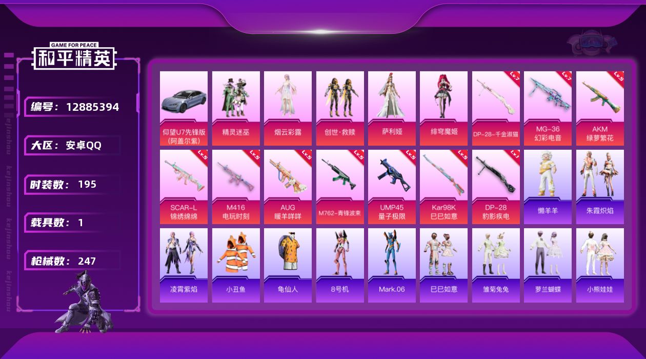 [12885394]【1362】安卓 手Q-5粉装-10特效枪-1载具-1粉色飞行器-79740热力值-14王牌印记-195套装-247枪皮 【热门品类】:套装-小丑鱼,套装-龟仙人,角色-8号机,角色-Mark.06 【粉色载具】:仰望U7(阿盖尔紫) 【粉色套装】:粉装-精灵迷巫,角色-烟云彩露,套装-创世·救赎,角色-萨利娅,角色-绯穹魔姬 【粉色枪皮等级】:AKM-绿萝繁花(五级),SCAR-L-锦绣绵绵(五级),M416-电玩时刻(五级),AUG-暖羊咩咩(五级),M762-青锋波束(五级),UMP45-量子极限(五级),Kar98K-巳巳如意(五级),DP-28-千金淑猫(七级),DP-28-豹影疾电(一级),MG-36-幻彩电音(七级) 【粉色枪皮】:AKM-绿萝繁花,SCAR-L-锦绣绵绵,M416-电玩时刻,AUG-暖羊咩咩,M762-青锋波束,UMP45-量子极限,Kar98K-巳巳如意,DP-28-千金淑猫,DP-28-豹影疾电,MG-36-幻彩电音 【粉色飞行器】:齐天大圣飞行器 【粉色降落伞】:银河战甲降落伞,暗夜玫瑰降落伞,海螺星光降落伞,精灵梦叶罗丽降落伞,忍者神龟降落伞,千金淑猫降落伞,星穹咏叹调降落伞,绯穹魔姬降落伞,魔童闹海 哪吒降落伞 【稀有套装】:套装-龟仙人,套装-巳巳如意,套装-雏菊兔兔,套装-萝兰蝴蝶,套装-小熊娃娃,角色-拉斐尔,套装-糖糖葫芦,套装-青团波波,套装-棉花软糖,角色-摩登魅猫,角色-光矢逐梦,套装-燕燕于飞,套装-鱼渊荷华,套装-粉恋花,套装-紫幽梦,套装-蓝冰羽,角色-瑰梦爱神,套装-彩虹兔,套装-云朵鹅,套装-雪绒豹,角色-夜瞳黯灵,套装-朱霞炽焰,套装-凌霄紫焰,玩偶服-懒羊羊 【稀有枪皮】:AKM-冰凉西瓜,AKM-夜灯,AKM-彩虹符号,AKM-破晓战魂,AKM-萌趣颜团子,AKM-虎虎生威,AKM-霓虹街区,AKM-龙的传人,M16A4-凝视深渊,M16A4-幻世战舞者,M16A4-甜心亚梦,M16A4-千金淑猫,SCAR-L-玉兔迎春,SCAR-L-红色方程式,SCAR-L-黄金龙骨,M416-夜灯,M416-糯团青竹,M416-红色方程式,M416-黄金龙骨,GROZA-异彩先驱,GROZA-田园牧歌,GROZA-黑色刀锋,AUG-耀粉歌者,QBZ-洛神天依,QBZ-飞驰魅影,M762-天降萌叽,M762