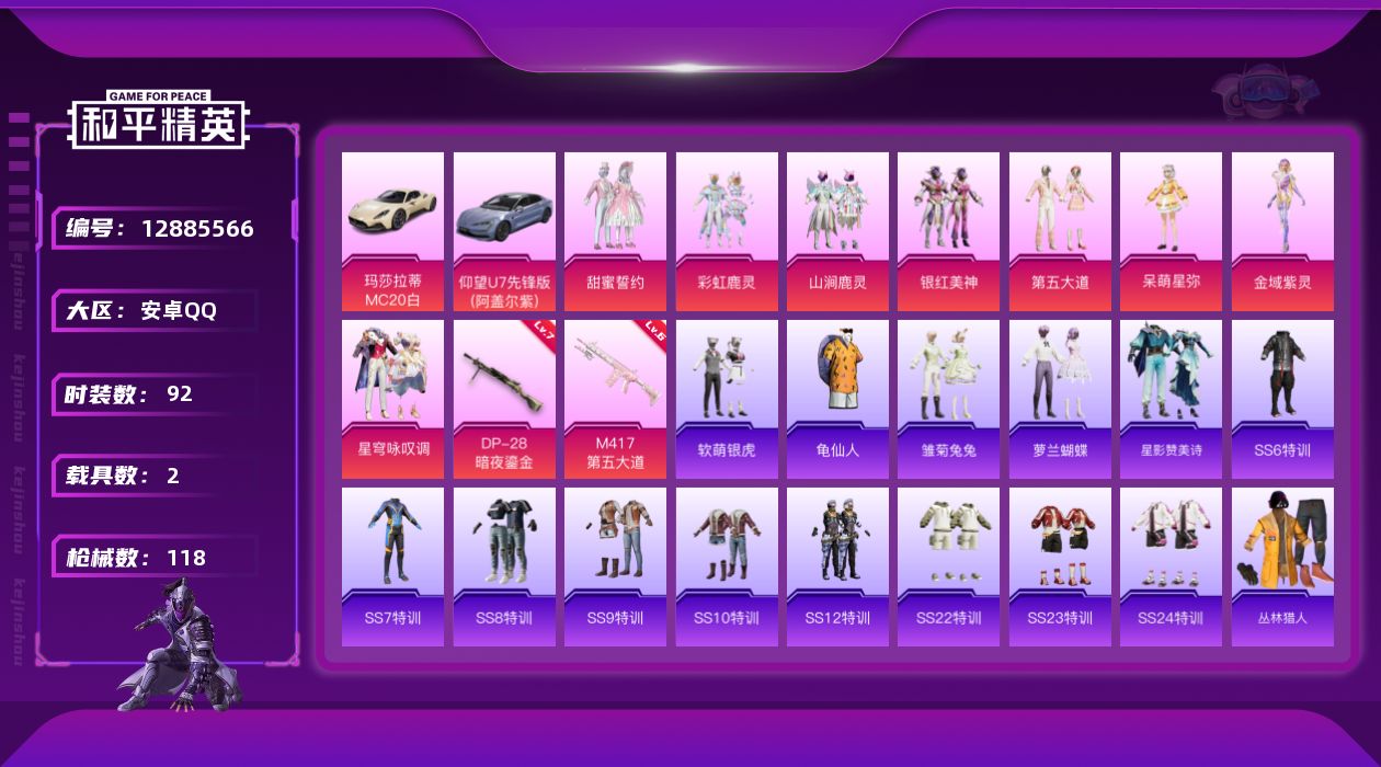 [12885566]【1365】安卓 手Q-10粉装-2特效枪-2载具-3粉色飞行器-41333热力值-1王牌印记-92套装-118枪皮 【热门品类】:套装-龟仙人,大砍刀-青龙偃月刀 【粉色载具】:玛莎拉蒂MC20(星石白),仰望U7(阿盖尔紫) 【粉色套装】:粉装-甜蜜誓约,粉装-彩虹鹿灵,粉装-山涧鹿灵,粉装-银红美神,粉装-第五大道,角色-呆萌星弥,角色-金域紫灵,粉装-星穹咏叹调 【粉色枪皮等级】:M417-第五大道(六级),DP-28-暗夜鎏金(七级) 【粉色枪皮】:M417-第五大道,DP-28-暗夜鎏金 【粉色飞行器】:心之恋语飞行翼,黄族统领飞行器,魔法神域飞行器 【粉色降落伞】:炫紫旋律降落伞,神秘黑猫降落伞,伏魔团降落伞,四圣焕新降落伞,心之恋语降落伞,林间仙鹿降落伞,旋转彩虹降落伞,暗夜鎏金降落伞,音爆索尼克降落伞,第五大道降落伞,莲影清波降落伞,魔法神域降落伞,时空协奏降落伞,星穹咏叹调降落伞 【稀有套装】:套装-龟仙人,套装-雏菊兔兔,套装-萝兰蝴蝶,套装-星影赞美诗 【稀有枪皮】:AKM-灼热熔岩,M16A4-九霄,SCAR-L-炫彩节奏,M416-夜灯,M416-糯团青竹,M416-红色方程式,M416-蓝色火焰,GROZA-懵萌河马,GROZA-林间仙鹿,GROZA-田园牧歌,GROZA-马卡龙,GROZA-黑色刀锋,AUG-天降萌叽,QBZ-原初圣火,QBZ-彩虹符号,QBZ-潮汐统领,M762-天降萌叽,M762-暗夜鎏金,M762-牛气冲天,Mk47-妙红点点,Mk47-林间仙鹿,G36C-不夜海上花,G36C-懵萌河马,UZI-众神之王,UZI-天降萌叽,UMP45-生命誓言,Vector-PEL轰鸣竞梦者,Vector-生命誓言,Vector-田园牧歌,Vector-音爆索尼克,Vector-黑色刀锋,汤姆逊-勇闯险境,汤姆逊-暗夜鎏金,汤姆逊-林间仙鹿,MP5K-众神之王,MP5K-飒粉甜心,Kar98K-勇闯险境,M24-歌者泠鸢,M24-仲夏莫吉托,M24-众神之王,AWM-不夜海上花,SKS-勇闯险境,SKS-未来歌姬,VSS-彩虹符号,VSS-田园牧歌,VSS-黑色刀锋,Mini14-原初圣火,Mini14-林间仙鹿,Mini14-炫彩节奏,Mini14-金鼠迎春,SLR-众神之王,SLR-彩虹符号,QBU-不夜海上花,莫辛纳甘-