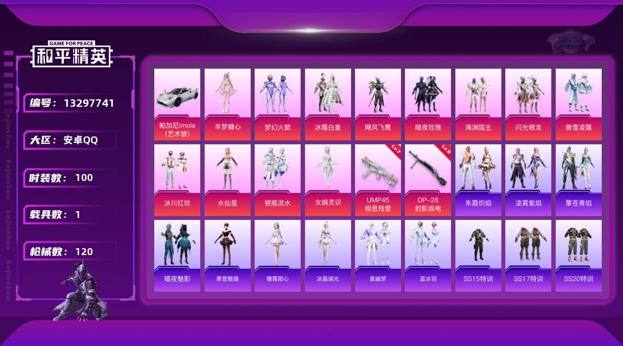 - PX_2052144- 苹果手Q-13王牌印记-6粉装-6特效枪-0载具-71309热力值-192套装-221枪皮-1卓越印记-0传奇印记 【6粉装】,飓风飞鹰,炫光之旅,寒光使者,莲影清波,金域紫灵,绚金战神 【6特效枪】AKM-绿萝繁花-5级 SCAR-L-锦绣绵绵-5级 M416-五爪金龙-7级 Kar98K-巳巳如意-5级 Mk14-甜梦熊击-5级 UMP45-量子极限-5级 【5稀有紫
