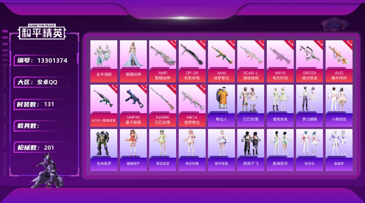 [13301374]【1427】安卓 手Q-2粉装-11特效枪-0载具-0粉色飞行器-57390热力值-17王牌印记-131套装-201枪皮 【热门品类】:套装-龟仙人 【粉色套装】:粉装-金丰海韵,角色-智耀战神 【粉色枪皮等级】:AKM-绿萝繁花(五级),SCAR-L-锦绣绵绵(五级),M416-电玩时刻(五级),GROZA-镜光银凌(五级),AUG-暖羊咩咩(五级),M762-青锋波束(五级),UMP45-量子极限(五级),Kar98K-巳巳如意(五级),Mk14-甜梦熊击(五级),AMR-智耀战神(七级),DP-28-豹影疾电(五级) 【粉色枪皮】:AKM-绿萝繁花,SCAR-L-锦绣绵绵,M416-电玩时刻,GROZA-镜光银凌,AUG-暖羊咩咩,M762-青锋波束,UMP45-量子极限,Kar98K-巳巳如意,Mk14-甜梦熊击,AMR-智耀战神,DP-28-豹影疾电 【粉色降落伞】:四圣焕新降落伞,垂柳戏鸭降落伞,未来歌姬降落伞,圣堂之誓降落伞,创世·救赎降落伞,绯穹魔姬降落伞 【稀有套装】:套装-龟仙人,套装-巳巳如意,套装-雏菊兔兔,套装-萝兰蝴蝶,套装-小熊娃娃,角色-多纳泰罗,套装-糖糖葫芦,套装-青团波波,套装-棉花软糖,角色-都市丽猫,套装-燕燕于飞,套装-鱼渊荷华,套装-粉恋花,套装-紫幽梦,套装-蓝冰羽,角色-瑰梦爱神,套装-霓虹热舞,套装-彩虹兔,套装-云朵鹅,套装-雪绒豹 【稀有枪皮】:AKM-夜灯,AKM-彩虹符号,AKM-星之彼岸,AKM-江南烟雨,AKM-灼热熔岩,AKM-破晓战魂,AKM-萌趣颜团子,AKM-虎虎生威,AKM-霓虹街区,AKM-龙的传人,M16A4-幻世战舞者,M16A4-红色方程式,M16A4-蓝色火焰,M16A4-千金淑猫,SCAR-L-夜灯,SCAR-L-扶摇飞仙,SCAR-L-玉兔迎春,SCAR-L-生命誓言,SCAR-L-红色方程式,M416-夜灯,M416-糯团青竹,M416-红色方程式,M416-蓝色火焰,AUG-天降萌叽,AUG-耀粉歌者,QBZ-彩虹符号,M762-天降萌叽,M762-彩虹符号,M762-牛气冲天,M762-云朵鹅,G36C-星穹咏叹调,AC-VAL-天降萌叽,AC-VAL-快闪甜心,蜜獾-天降萌叽,UZI-古堡领主,UZI-啾咪啾咪,UZI-天降萌叽,UZI-炫彩节奏,UZI-生命誓言,UZ