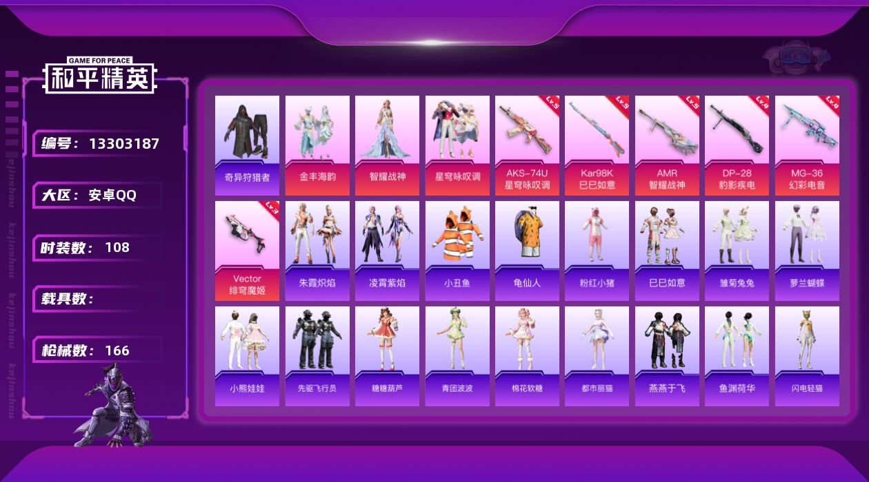 [13303187]【1437】安卓 手Q-3粉装-6特效枪-0载具-0粉色飞行器-47492热力值-9王牌印记-108套装-166枪皮 【热门品类】:套装-小丑鱼,套装-奇异狩猎者,套装-龟仙人,套装-粉红小猪 【粉色套装】:粉装-金丰海韵,角色-智耀战神,粉装-星穹咏叹调 【粉色枪皮等级】:Vector-绯穹魔姬(三级),AKS-74U-星穹咏叹调(五级),Kar98K-巳巳如意(五级),AMR-智耀战神(五级),DP-28-豹影疾电(四级),MG-36-幻彩电音(四级) 【粉色枪皮】:Vector-绯穹魔姬,AKS-74U-星穹咏叹调,Kar98K-巳巳如意,AMR-智耀战神,DP-28-豹影疾电,MG-36-幻彩电音 【粉色降落伞】:炙焰牛王降落伞,彩虹甜喵降落伞,音爆索尼克降落伞,金丰海韵降落伞,拳皇·狂花道降落伞,未来领航者降落伞,千金淑猫降落伞,临安公主降落伞,智耀战神降落伞,星穹咏叹调降落伞,幻彩电音降落伞,荧海星豚降落伞,喜羊羊与灰太狼降落伞 【稀有套装】:套装-龟仙人,套装-巳巳如意,套装-雏菊兔兔,套装-萝兰蝴蝶,套装-小熊娃娃,套装-先驱飞行员,套装-糖糖葫芦,套装-青团波波,套装-棉花软糖,角色-都市丽猫,套装-燕燕于飞,套装-鱼渊荷华,套装-闪电轻猫,套装-粉恋花,套装-紫幽梦,套装-蓝冰羽,角色-瑰梦爱神,套装-星影赞美诗,套装-星渊小夜曲,套装-彩虹兔,套装-云朵鹅,套装-雪绒豹,套装-朱霞炽焰,套装-凌霄紫焰 【稀有枪皮】:AKM-彩虹符号,AKM-破晓战魂,AKM-虎虎生威,AKM-霓虹街区,AKM-龙的传人,M16A4-幻世战舞者,M16A4-甜心亚梦,M16A4-红色方程式,M16A4-蓝色火焰,SCAR-L-炫彩节奏,SCAR-L-玉兔迎春,SCAR-L-生命誓言,SCAR-L-红色方程式,M416-糯团青竹,M416-红色方程式,M416-蓝色火焰,AUG-天降萌叽,AUG-幻影战神,AUG-甜蜜菠萝,AUG-耀粉歌者,QBZ-彩虹符号,QBZ-神秘黑猫,QBZ-飞驰魅影,M762-天星战神,M762-天降萌叽,M762-云朵鹅,G36C-暗夜玫瑰,G36C-星穹咏叹调,AC-VAL-天降萌叽,AC-VAL-甜心亚梦,蜜獾-天降萌叽,蜜獾-娇憨猪猪,ARX-凌霄紫焰,UZI-天降萌叽,UZI-娇憨猪猪,UZI-影袭,UZI-炫彩节奏,UZI