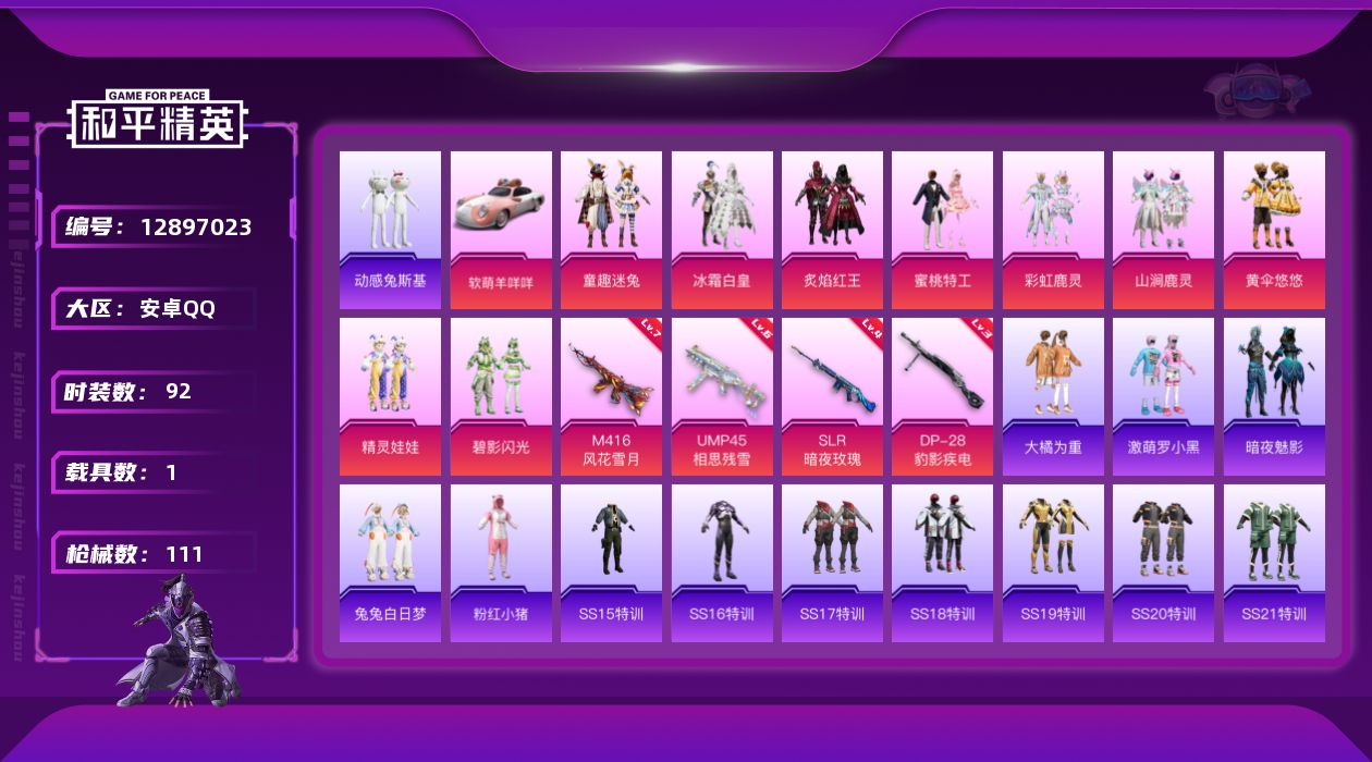 - [17228476]安卓 手Q-10粉装-7特效枪-0载具-4粉色飞行器-81635热力值-8王牌印记-170套装-237枪皮 【热门品类】:粉装-梦幻火箭,套装-龟仙人,套装-粉红小猪 【粉色套装】:粉装-梦幻火箭,粉装-蝶舞蔷薇,粉装-恐龙拽拽,粉装-垂柳戏鸭,角色-蔷薇星,角色-烟云彩露,角色-美雪,角色-樱桃泡泡,粉装-星穹咏叹调,角色-奇迹舞步 美雪 【粉色枪皮等级】:SCAR-L-梦幻火箭(七级),UMP45-恐龙拽拽(七级),Kar98K-巳巳如意(五级),Mk14-樱桃泡泡(三级),M200-梦海之灵(三级),DP-28-豹影疾电(五级),PKM-江南烟雨(七级) 【粉色枪皮】:SCAR-L-梦幻火箭,UMP45-恐龙拽拽,Kar98K-巳巳如意,Mk14-樱桃泡泡,M200-梦海之灵,DP-28-豹影疾电,PKM-江南烟雨 【粉色飞行器】:庄周梦蝶飞行器,幻海精灵飞行器,暮色之舞飞行器 【粉色降落伞】:甜蜜誓约降落伞,心之恋语降落伞,童趣迷兔降落伞,香水柠檬降落伞,绿意幻情降落伞,恐龙拽拽降落伞,圣光天使降落伞,环太平洋降落伞,垂柳戏鸭降落伞,闲梦青缨降落伞,炫光之旅降落伞,莲影清波降落伞,精灵梦叶罗丽降落伞,冠军兔兔降落伞,金丰海韵降落伞,幻彩电音降落伞,喜羊羊与灰太狼降落伞 【稀有套装】:套装-龟仙人,角色-摩登魅猫,套装-晶辉守护,套装-粉恋花,套装-紫幽梦,套装-蓝冰羽,套装-星渊小夜曲,套装-云朵鹅,套装-雪绒豹,角色-灵公主,套装-朱霞炽焰,套装-凌霄紫焰,玩偶服-喜羊羊,套装-书海巡游,套装-画境星梦,套装-琴音绮想,角色-鎏光妙舞 【稀有枪皮】:AKM-夜灯,AKM-奇异狩猎者,AKM-彩虹符号,AKM-恐龙拽拽,AKM-灼热熔岩,AKM-破晓战魂,AKM-霓虹街区,AKM-龙的传人,M16A4-幻世战舞者,M16A4-甜心亚梦,M16A4-红色方程式,M16A4-千金淑猫,SCAR-L-玉兔迎春,SCAR-L-红色方程式,SCAR-L-金风玉露,SCAR-L-冷漠罗丽,M416-摩登王国,M416-糯团青竹,M416-红色方程式,M416-蓝色火焰,GROZA-异彩先驱,GROZA-彩虹符号,GROZA-恐龙拽拽,GROZA-春暖花开,GROZA-治愈之星,GROZA-生命誓言,GROZA-田园牧歌,AUG-冰川粉黛,AUG-凝视深渊,AUG-天降