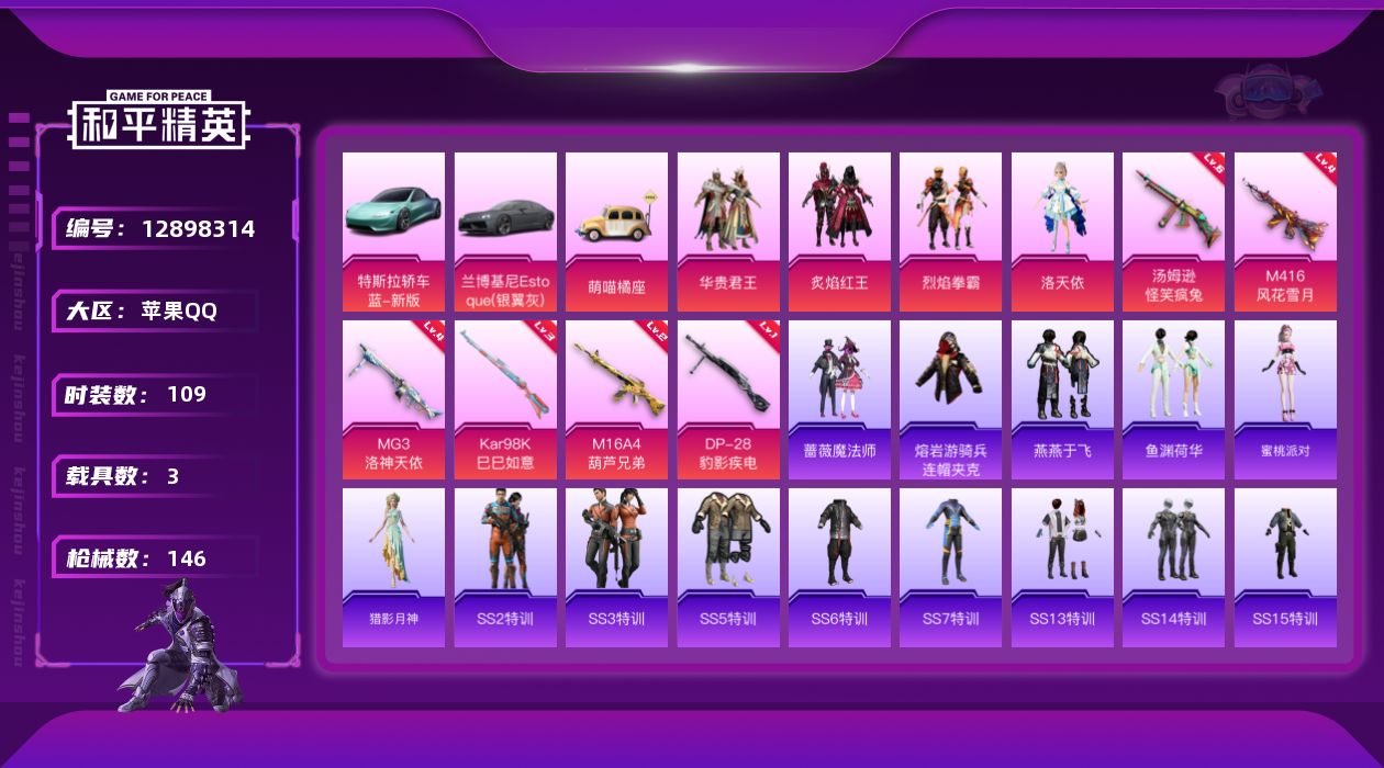 [12898314]【1445】苹果 手Q-4粉装-6特效枪-3载具-2粉色飞行器-48062热力值-2王牌印记-109套装-146枪皮 【热门品类】:小恶魔头饰,熔岩游骑兵面罩,熔岩游骑兵连帽夹克 【粉色载具】:特斯拉Roadster(水滴蓝),兰博基尼Estoque(银翼灰),萌喵橘座 【粉色套装】:粉装-华贵君王,粉装-炙焰红王,粉装-烈焰拳霸,角色-洛天依 【粉色枪皮等级】:M16A4-葫芦兄弟(二级),M416-风花雪月(四级),汤姆逊-怪笑疯兔(六级),Kar98K-巳巳如意(三级),DP-28-豹影疾电(一级),MG3-洛神天依(四级) 【粉色枪皮】:M16A4-葫芦兄弟,M416-风花雪月,汤姆逊-怪笑疯兔,Kar98K-巳巳如意,DP-28-豹影疾电,MG3-洛神天依 【粉色飞行器】:绮梦青鸾飞行器,齐天大圣飞行器 【粉色降落伞】:百万伏特降落伞,至尊龙雀降落伞,精灵迷巫降落伞,梦幻火箭降落伞,激战未来降落伞,银刃赛罗降落伞,怪笑疯兔降落伞,葫芦兄弟降落伞,暗夜玫瑰降落伞,洛神天依降落伞,樱桃泡泡降落伞 【稀有套装】:套装-燕燕于飞,套装-鱼渊荷华,角色-蜜桃派对,角色-猎影月神 【稀有枪皮】:AKM-冰凉西瓜,AKM-四圣焕新,AKM-夜灯,AKM-生命誓言,AKM-破晓战魂,AKM-萌趣颜团子,AKM-虎虎生威,AKM-霓虹街区,M16A4-夜灯,M16A4-幻世战舞者,M16A4-生命誓言,M16A4-蓝色火焰,M16A4-魔法学院,SCAR-L-炫彩节奏,SCAR-L-生命誓言,SCAR-L-黄金龙骨,M416-绯红前夜,M416-蓝色火焰,M416-魔法学院,GROZA-彩虹符号,GROZA-治愈之星,GROZA-生命誓言,GROZA-银河战甲,GROZA-黑色刀锋,AUG-耀粉歌者,AUG-青春冒险家,AUG-魅夜紫皇,AUG-魔法学院,QBZ-洛神天依,QBZ-赛罗,M762-天降萌叽,M762-拳皇97,M762-瑞龙福将,M762-绯红前夜,Mk47-洛神天依,Mk47-百万伏特,Mk47-青春冒险家,G36C-时空追击者,G36C-暗夜玫瑰,G36C-绮梦青鸾,Famas-月下星之子,UZI-天降萌叽,UZI-炫彩节奏,UZI-生命誓言,UMP45-夜灯,UMP45-快乐主宰,UMP45-时空追击者,UMP45-春暖花开,Vector-夜灯,Ve