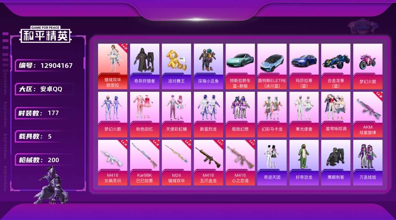 [12904167]【1449】安卓 手Q-1神装-9粉装-6特效枪-5载具-6粉色飞行器-75107热力值-2王牌印记-177套装-200枪皮 【红色神装等级】:镜域双华-欧若拉(二级) 【红色角色神装】:镜域双华-欧若拉 【热门品类】:粉装-梦幻火箭,套装-浪漫天命,套装-派对舞王,套装-深海小丑鱼,套装-奇异狩猎者,套装-忍者信条,旭日初心兜帽大衣,套装-粉红小猪,熔岩游骑兵面罩,熔岩游骑兵连帽夹克 【粉色载具】:特斯拉Roadster(水滴蓝),路特斯ELETRE(冰川蓝),玛莎拉蒂Ghibli(蓝),合金龙骨(蓝),双人摩托-梦幻火箭 【粉色套装】:粉装-粉色回忆,粉装-天使彩虹糖,粉装-梦幻火箭,粉装-新星烈龙,粉装-极致幻想,粉装-幻彩马卡龙,粉装-寒光使者,粉装-星穹咏叹调 【粉色枪皮等级】:AKM-炫紫旋律(六级),M416-五爪金龙(一级),M416-心之恋语(一级),M416-女娲灵识(三级),Kar98K-巳巳如意(三级),M24-镜域双华(二级) 【粉色枪皮】:AKM-炫紫旋律,M416-五爪金龙,M416-心之恋语,M416-女娲灵识,Kar98K-巳巳如意,M24-镜域双华 【粉色飞行器】:梦幻火箭飞行器,天之羽翼飞行器,圣光天使飞行器,镜域双华-灵镜之阶,深渊漩涡飞行器,圣域金龙飞行器 【粉色降落伞】:深海曼妙降落伞,甜心宝贝降落伞,梦幻火箭降落伞,神秘黑猫降落伞,荧光虫舞降落伞,银刃赛罗降落伞,王牌四分卫降落伞,环太平洋降落伞,音爆索尼克降落伞,镜域双华降落伞,江南烟雨降落伞,精灵梦叶罗丽降落伞,金丰海韵降落伞,宇宙意志降落伞,拳皇·狂花道降落伞,英伦信使降落伞,BEARBRICK降落伞,圣域龙灵降落伞,幻彩电音降落伞 【稀有套装】:套装-巳巳如意,套装-雏菊兔兔,套装-萝兰蝴蝶,套装-小熊娃娃,套装-燕燕于飞,套装-鱼渊荷华,套装-紫幽梦,套装-蓝冰羽,套装-星影赞美诗 【稀有枪皮】:AKM-冰凉西瓜,AKM-四圣焕新,AKM-夜灯,AKM-奇异狩猎者,AKM-彩虹符号,AKM-百万伏特,AKM-萌趣颜团子,AKM-虎虎生威,AKM-霓虹街区,M16A4-幻世战舞者,M16A4-生命誓言,M16A4-魔法学院,SCAR-L-炫彩节奏,SCAR-L-王牌四分卫,SCAR-L-生命誓言,SCAR-L-黄金龙骨,M416-仓鼠灰灰,M416-夜灯,M41