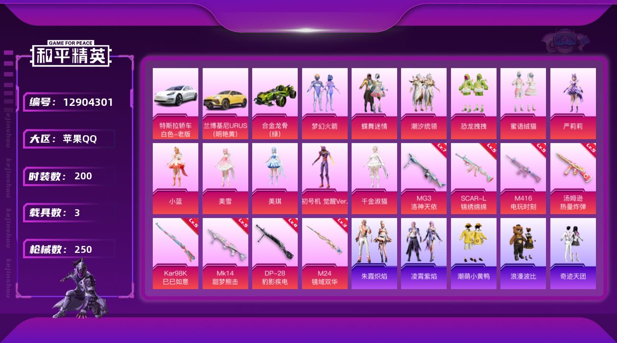 [12904301]【1450】苹果 手Q-11粉装-8特效枪-3载具-2粉色飞行器-83190热力值-6王牌印记-200套装-250枪皮 【热门品类】:粉装-梦幻火箭,角色-军刀雅典娜,套装-龟仙人,套装-潮萌小黄鸭,套装-浪漫波比,小恶魔头饰,熔岩游骑兵面罩,熔岩游骑兵连帽夹克 【粉色载具】:特斯拉Model 3(珍珠白),兰博基尼URUS(明艳黄),合金龙骨(绿) 【粉色套装】:粉装-蝶舞迷情,粉装-梦幻火箭,粉装-潮汐统领,粉装-恐龙拽拽,粉装-蜜语绒猫,角色-严莉莉,角色-小蓝,角色-美雪,角色-美琪,角色-初号机 觉醒Ver.,角色-千金淑猫 【粉色枪皮等级】:SCAR-L-锦绣绵绵(五级),M416-电玩时刻(五级),汤姆逊-热量炸弹(五级),Kar98K-巳巳如意(五级),M24-镜域双华(三级),Mk14-甜梦熊击(五级),DP-28-豹影疾电(四级),MG3-洛神天依(七级) 【粉色枪皮】:SCAR-L-锦绣绵绵,M416-电玩时刻,汤姆逊-热量炸弹,Kar98K-巳巳如意,M24-镜域双华,Mk14-甜梦熊击,DP-28-豹影疾电,MG3-洛神天依 【粉色飞行器】:炫紫旋律飞行器,镜域双华-灵镜之阶 【粉色降落伞】:快乐主宰降落伞,春暖花开降落伞,梦幻火箭降落伞,金风玉露降落伞,炫紫旋律降落伞,神秘黑猫降落伞,银刃赛罗降落伞,洛神天依降落伞,绿意幻情降落伞,旋转彩虹降落伞,镜域双华降落伞,江南烟雨降落伞,巴啦啦小魔仙降落伞 【稀有套装】:套装-龟仙人,套装-巳巳如意,套装-雏菊兔兔,套装-萝兰蝴蝶,套装-小熊娃娃,套装-粉恋花,套装-紫幽梦,套装-蓝冰羽,套装-星影赞美诗,套装-彩虹兔,套装-云朵鹅,套装-雪绒豹,套装-蜜露汐语,套装-朱霞炽焰,套装-凌霄紫焰 【稀有枪皮】:AKM-冰凉西瓜,AKM-奇异狩猎者,AKM-星之彼岸,AKM-玉龙,AKM-破晓战魂,AKM-虎虎生威,AKM-霓虹街区,M16A4-幻世战舞者,M16A4-星际漫游,M16A4-生命誓言,M16A4-红色方程式,SCAR-L-炫彩节奏,SCAR-L-玉兔迎春,SCAR-L-红色方程式,SCAR-L-雷霆特警,M416-仓鼠灰灰,M416-红色方程式,M416-绯红前夜,M416-蓝色火焰,M416-魔法学院,GROZA-异彩先驱,GROZA-蓝莓炮弹,GROZA-雷霆特警,GROZA-黑