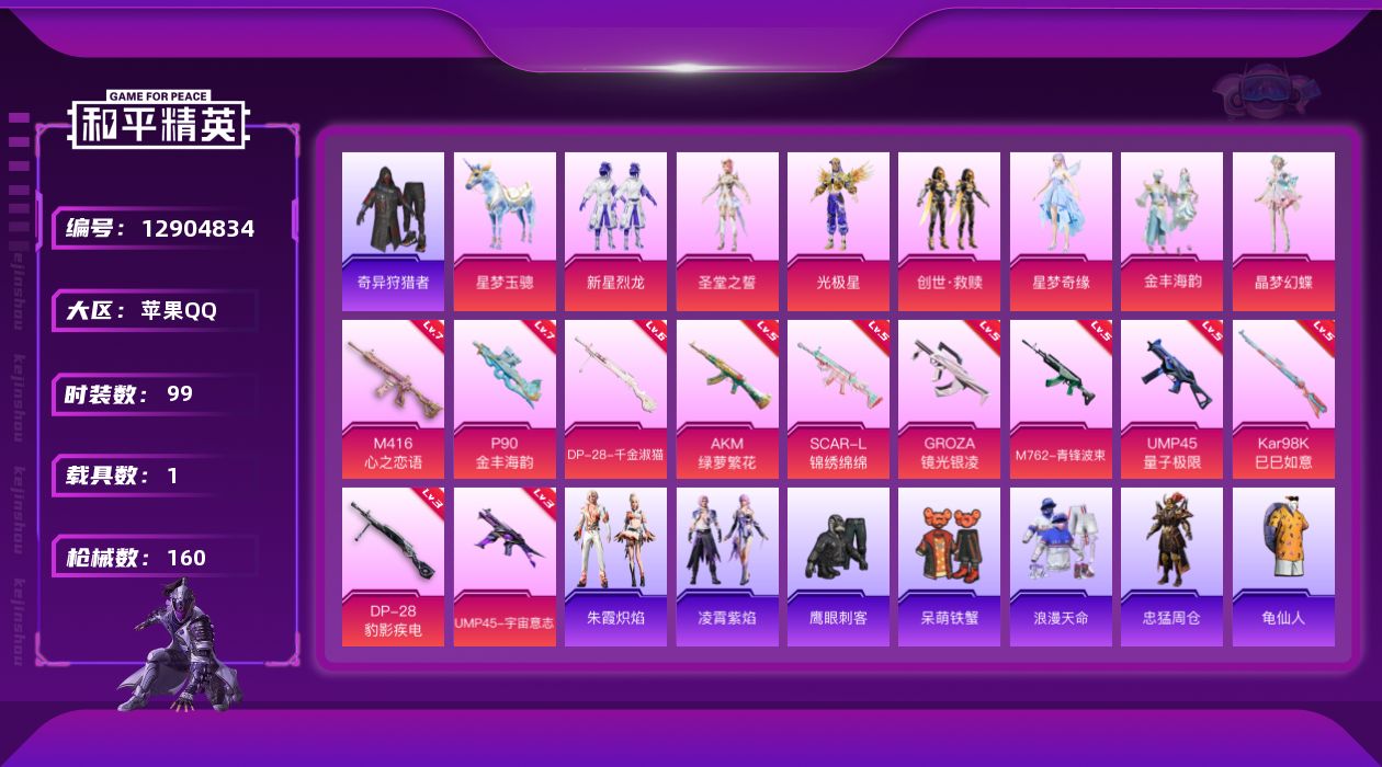 [12904834]【1453】苹果 手Q-7粉装-11特效枪-1载具-7粉色飞行器-55688热力值-7王牌印记-99套装-160枪皮 【热门品类】:套装-浪漫天命,套装-奇异狩猎者,角色-忠猛周仓,套装-龟仙人,套装-暗影哥特,角色-8号机,角色-Mark.06 【粉色载具】:星梦玉骢 【粉色套装】:粉装-新星烈龙,角色-圣堂之誓,角色-光极星,套装-创世·救赎,角色-星梦奇缘,粉装-金丰海韵,角色-晶梦幻蝶 【粉色枪皮等级】:AKM-绿萝繁花(五级),SCAR-L-锦绣绵绵(五级),M416-心之恋语(七级),GROZA-镜光银凌(五级),M762-青锋波束(五级),UMP45-量子极限(五级),UMP45-宇宙意志(三级),P90-金丰海韵(七级),Kar98K-巳巳如意(五级),DP-28-千金淑猫(六级),DP-28-豹影疾电(三级) 【粉色枪皮】:AKM-绿萝繁花,SCAR-L-锦绣绵绵,M416-心之恋语,GROZA-镜光银凌,M762-青锋波束,UMP45-量子极限,UMP45-宇宙意志,P90-金丰海韵,Kar98K-巳巳如意,DP-28-千金淑猫,DP-28-豹影疾电 【粉色飞行器】:镜光幻境飞行翼,镜域双华-灵镜之阶,龙翔九天飞行器,幻海精灵飞行器,深渊漩涡飞行器,飞天猪飞行器 【粉色降落伞】:极限特训降落伞,洛神天依降落伞,天之羽翼降落伞,第五大道降落伞,炎氏战神降落伞,圣堂之誓降落伞,小叽联名款降落伞,祥瑞锦鲤降落伞,精灵梦叶罗丽降落伞,星梦奇缘降落伞,金丰海韵降落伞,宇宙意志降落伞,千金淑猫降落伞,樱桃泡泡降落伞 【稀有套装】:套装-龟仙人,套装-雏菊兔兔,套装-萝兰蝴蝶,套装-小熊娃娃,套装-糖糖葫芦,套装-青团波波,套装-棉花软糖,角色-摩登魅猫,套装-晶灵使者,套装-朱霞炽焰,套装-凌霄紫焰 【稀有枪皮】:AKM-奇异狩猎者,AKM-影袭,AKM-缤纷海域,AKM-霓虹街区,AKM-龙的传人,M16A4-莲影清波,M16A4-千金淑猫,SCAR-L-夜灯,M416-摩登王国,M416-糯团青竹,M416-绯红前夜,GROZA-影袭,AUG-青春冒险家,QBZ-潮汐统领,M762-奇异狩猎者,M762-绯红前夜,Mk47-摩登王国,G36C-星穹咏叹调,AC-VAL-快闪甜心,AC-VAL-闲梦青缨,蜜獾-天降萌叽,ARX-凌霄紫焰,UZI-啾咪啾咪