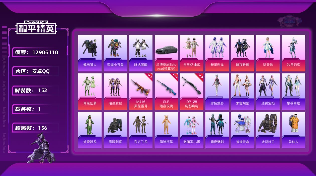 [12905110]【1455】安卓 手Q-7粉装-3特效枪-1载具-0粉色飞行器-53625热力值-9王牌印记-153套装-156枪皮 【热门品类】:套装-浪漫天命,套装-都市猎人,套装-深海小丑鱼,套装-胖达圆圆,套装-金羽特工,套装-AG战队服,套装-SS1特训,套装-龟仙人,套装-暗影哥特,套装-粉红小猪,熔岩游骑兵面罩 【粉色载具】:兰博基尼Estoque(银翼灰) 【粉色套装】:粉装-宝贝奶油派,粉装-新星烈龙,粉装-暗夜玫瑰,角色-洛天依,粉装-吟月归客,粉装-青葱仙萝,粉装-暗星紫秘 【粉色枪皮等级】:M416-风花雪月(七级),SLR-暗夜玫瑰(七级),DP-28-豹影疾电(五级) 【粉色枪皮】:M416-风花雪月,SLR-暗夜玫瑰,DP-28-豹影疾电 【粉色降落伞】:甜心宝贝降落伞,暗夜玫瑰降落伞,洛神天依降落伞,风花雪月降落伞,流星咚咚降落伞,甜心娃娃降落伞,橘柚倾心降落伞,炙焰牛王降落伞 【稀有套装】:套装-龟仙人,套装-雏菊兔兔,套装-萝兰蝴蝶,套装-朱霞炽焰,套装-凌霄紫焰,套装-擎苍青焰,角色-绯色魅影 【稀有枪皮】:AKM-夜灯,AKM-彩虹符号,AKM-影袭,AKM-海渊国主,AKM-灼热熔岩,AKM-破晓战魂,AKM-虎虎生威,AKM-霓虹街区,M16A4-幻世战舞者,SCAR-L-暗夜玫瑰,SCAR-L-炫彩节奏,SCAR-L-生命誓言,M416-夜灯,M416-糯团青竹,M416-红色方程式,GROZA-异彩先驱,GROZA-影袭,GROZA-恐龙拽拽,GROZA-懵萌河马,GROZA-生命誓言,GROZA-田园牧歌,AUG-天降萌叽,AUG-灵符少年,QBZ-彩虹符号,QBZ-洛神天依,QBZ-绚金瑰梦,QBZ-飞驰魅影,M762-天降萌叽,M762-奇异狩猎者,M762-牛气冲天,M762-瑞龙福将,M762-甜心宝贝,M762-风花雪月,Mk47-洛神天依,G36C-懵萌河马,G36C-暗夜玫瑰,AC-VAL-天降萌叽,蜜獾-天降萌叽,蜜獾-娇憨猪猪,ARX-凌霄紫焰,UZI-娇憨猪猪,UZI-影袭,UZI-炫彩节奏,UZI-生命誓言,UZI-红色方程式,UMP45-夜灯,UMP45-生命誓言,Vector-彩虹符号,Vector-暗夜玫瑰,Vector-生命誓言,Vector-田园牧歌,Vector-风花雪月,汤姆逊-奇异狩猎者,汤姆