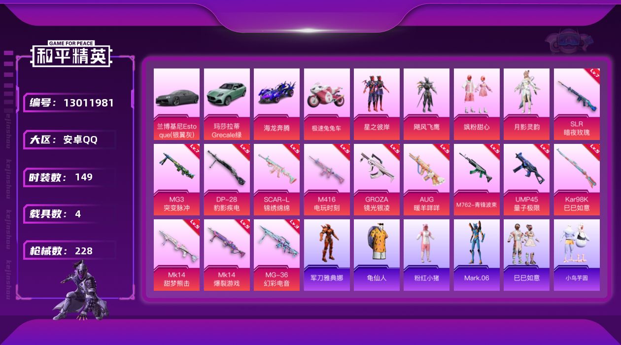 [13011981]【1472】安卓 手Q-4粉装-13特效枪-4载具-1粉色飞行器-74679热力值-11王牌印记-149套装-228枪皮