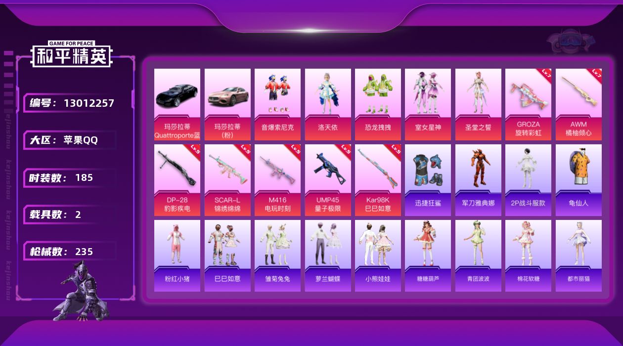 [13012257]【1473】苹果 手Q-5粉装-7特效枪-2载具-0粉色飞行器-82705热力值-9王牌印记-185套装-235枪皮 【热门品类】:粉装-音爆索尼克,角色-军刀雅典娜,角色-2P战斗服款,套装-龟仙人,套装-粉红小猪 【粉色载具】:玛莎拉蒂Quattroporte(夜幕蓝),玛莎拉蒂Ghibli(粉),僚机-萌兔起飞 【粉色套装】:角色-洛天依,粉装-恐龙拽拽,粉装-音爆索尼克,粉装-室女星神,角色-圣堂之誓 【粉色枪皮等级】:SCAR-L-锦绣绵绵(五级),M416-电玩时刻(五级),GROZA-旋转彩虹(七级),UMP45-量子极限(五级),Kar98K-巳巳如意(五级),AWM-橘柚倾心(七级),DP-28-豹影疾电(五级) 【粉色枪皮】:SCAR-L-锦绣绵绵,M416-电玩时刻,GROZA-旋转彩虹,UMP45-量子极限,Kar98K-巳巳如意,AWM-橘柚倾心,DP-28-豹影疾电 【粉色降落伞】:炫紫旋律降落伞,烈焰拳霸降落伞,齐天大圣降落伞,洛神天依降落伞,暗星紫秘降落伞,青春物语降落伞,恐龙拽拽降落伞,垂柳戏鸭降落伞,千面幻镜降落伞,旋转彩虹降落伞,海螺星光降落伞,音爆索尼克降落伞,黄族统领降落伞,未来歌姬降落伞,猪猪侠降落伞,拳皇·狂花道降落伞 【稀有套装】:套装-龟仙人,套装-巳巳如意,套装-雏菊兔兔,套装-萝兰蝴蝶,套装-小熊娃娃,套装-糖糖葫芦,套装-青团波波,套装-棉花软糖,角色-都市丽猫,角色-摩登魅猫 【稀有枪皮】:AKM-2P战斗服款,AKM-夜灯,AKM-彩虹符号,AKM-星之彼岸,AKM-破晓战魂,AKM-萌趣颜团子,AKM-虎虎生威,AKM-霓虹街区,AKM-龙的传人,M16A4-幻世战舞者,M16A4-甜心亚梦,M16A4-生命誓言,M16A4-莲影清波,M16A4-千金淑猫,SCAR-L-暗夜玫瑰,SCAR-L-炫彩节奏,SCAR-L-玉兔迎春,SCAR-L-红色方程式,M416-糯团青竹,M416-红色方程式,M416-蓝色火焰,GROZA-异彩先驱,GROZA-彩虹符号,GROZA-懵萌河马,GROZA-梨园星光,GROZA-治愈之星,GROZA-田园牧歌,AUG-2P战斗服款,AUG-天降萌叽,AUG-耀粉歌者,AUG-青春冒险家,QBZ-彩虹符号,QBZ-未来歌姬,QBZ-洛神天依,QBZ-飞驰魅影,M762-天