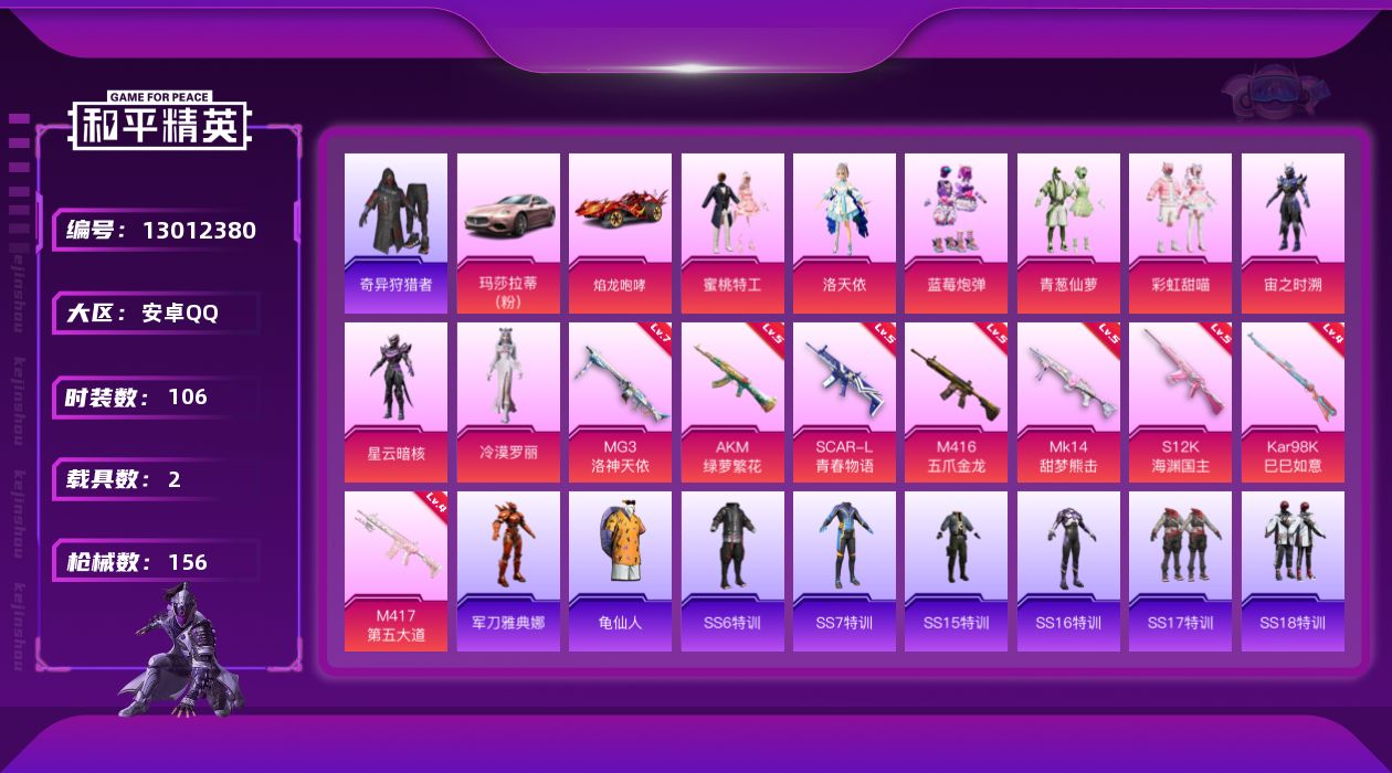 [13012380]【1474】安卓 手Q-8粉装-8特效枪-2载具-1粉色飞行器-55706热力值-10王牌印记-106套装-156枪皮 【热门品类】:套装-奇异狩猎者,角色-军刀雅典娜,套装-龟仙人 【粉色载具】:玛莎拉蒂Ghibli(粉),焰龙咆哮 【粉色套装】:粉装-蜜桃特工,角色-洛天依,粉装-蓝莓炮弹,粉装-青葱仙萝,粉装-彩虹甜喵,角色-宙之时溯,角色-星云暗核,角色-冷漠罗丽 【粉色枪皮等级】:AKM-绿萝繁花(五级),SCAR-L-青春物语(五级),M416-五爪金龙(五级),Kar98K-巳巳如意(四级),Mk14-甜梦熊击(五级),M417-第五大道(四级),S12K-海渊国主(五级),MG3-洛神天依(七级) 【粉色枪皮】:AKM-绿萝繁花,SCAR-L-青春物语,M416-五爪金龙,Kar98K-巳巳如意,Mk14-甜梦熊击,M417-第五大道,S12K-海渊国主,MG3-洛神天依 【粉色飞行器】:星夜魔法师飞行翼 【粉色降落伞】:洛神天依降落伞,炙焰牛王降落伞,环太平洋降落伞,太空嘟嘟降落伞,彩虹甜喵降落伞,暗夜鎏金降落伞,第五大道降落伞,圣堂之誓降落伞 【稀有套装】:套装-龟仙人 【稀有枪皮】:AKM-彩虹符号,AKM-海渊国主,AKM-灼热熔岩,AKM-环太平洋,AKM-缤纷海域,AKM-萌趣颜团子,AKM-虎虎生威,AKM-霓虹街区,M16A4-幻世战舞者,M16A4-甜心亚梦,SCAR-L-夜灯,SCAR-L-炫彩节奏,SCAR-L-玉兔迎春,SCAR-L-甜蜜誓约,SCAR-L-红色方程式,M416-糯团青竹,M416-红色方程式,GROZA-异彩先驱,GROZA-懵萌河马,GROZA-田园牧歌,AUG-天降萌叽,AUG-怪笑疯兔,AUG-青春冒险家,QBZ-妙趣可丽,QBZ-洛神天依,QBZ-神秘黑猫,M762-彩虹甜喵,M762-瑞龙福将,M762-第五大道,Mk47-妙红点点,Mk47-洛神天依,Mk47-炫光之旅,Mk47-青春冒险家,G36C-懵萌河马,G36C-时空追击者,AC-VAL-天降萌叽,AC-VAL-彩虹甜喵,AC-VAL-甜心亚梦,蜜獾-天降萌叽,蜜獾-娇憨猪猪,UZI-啾咪啾咪,UZI-天降萌叽,UZI-娇憨猪猪,UMP45-夜灯,UMP45-时空追击者,UMP45-海渊国主,UMP45-生命誓言,Vector-生命誓言