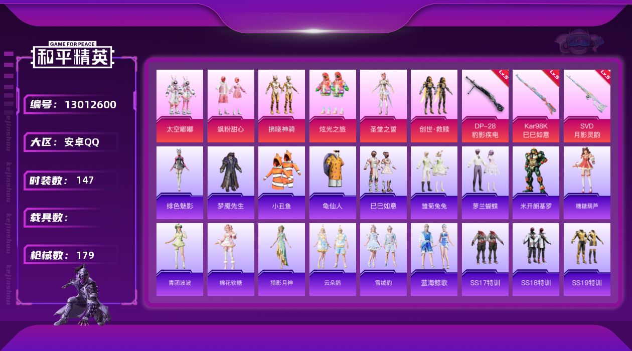 [13012600]【1475】安卓 手Q-6粉装-3特效枪-0载具-2粉色飞行器-53715热力值-14王牌印记-147套装-179枪皮 【热门品类】:套装-小丑鱼,套装-龟仙人 【粉色套装】:粉装-太空嘟嘟,粉装-飒粉甜心,粉装-拂晓神骑,粉装-炫光之旅,角色-圣堂之誓,套装-创世·救赎 【粉色枪皮等级】:Kar98K-巳巳如意(五级),SVD-月影灵韵(五级),DP-28-豹影疾电(五级) 【粉色枪皮】:Kar98K-巳巳如意,SVD-月影灵韵,DP-28-豹影疾电 【粉色降落伞】:梦幻火箭降落伞,筑梦精灵降落伞,旋转彩虹降落伞,拂晓神骑降落伞,闲梦青缨降落伞,雪月幻音降落伞,圣域龙灵降落伞 【稀有套装】:套装-龟仙人,套装-巳巳如意,套装-雏菊兔兔,套装-萝兰蝴蝶,角色-米开朗基罗,套装-糖糖葫芦,套装-青团波波,套装-棉花软糖,角色-猎影月神,套装-云朵鹅,套装-雪绒豹,套装-蓝海鲸歌,角色-绯色魅影 【稀有枪皮】:AKM-2P战斗服款,AKM-彩虹符号,AKM-灼热熔岩,AKM-环太平洋,AKM-破晓战魂,AKM-筑梦精灵,AKM-霓虹街区,AKM-龙的传人,M16A4-幻世战舞者,M16A4-甜心亚梦,M16A4-红色方程式,M16A4-蓝色火焰,SCAR-L-幽秘魅影,SCAR-L-玉兔迎春,SCAR-L-红色方程式,SCAR-L-冷漠罗丽,M416-夜灯,M416-月影鸳鸯,M416-糯团青竹,M416-红色方程式,M416-绯红前夜,M416-蓝色火焰,GROZA-恐龙拽拽,GROZA-懵萌河马,AUG-天降萌叽,AUG-耀粉歌者,QBZ-飞驰魅影,M762-天降萌叽,M762-奇异狩猎者,M762-绯红前夜,M762-云朵鹅,G36C-懵萌河马,AC-VAL-天降萌叽,AC-VAL-快闪甜心,AC-VAL-甜心亚梦,蜜獾-千面幻镜,蜜獾-天降萌叽,蜜獾-娇憨猪猪,UZI-啾咪啾咪,UZI-娇憨猪猪,UZI-红色方程式,UMP45-涂山之恋,UMP45-生命誓言,UMP45-蓝色火焰,Vector-生命誓言,汤姆逊-天降萌叽,汤姆逊-炫彩节奏,汤姆逊-耀粉歌者,P90-快闪甜心,P90-飞驰魅影,P90-巳巳如意,Kar98K-彩虹符号,Kar98K-炫彩节奏,Kar98K-红色方程式,Kar98K-飞驰魅影,Kar98K-星穹咏叹调,M24-炫彩节奏,SKS-心