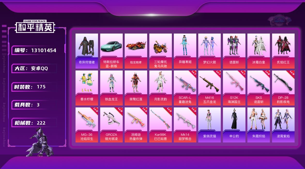 - [14551360]可二次【店主推荐捡漏号!可直接换绑】/素材身法号/无敌战神框1/绝世印记1/地铁满天赋 苹果 手Q-无敌战神框-5粉装-6特效枪-3粉色飞行器-5w热力值-8王牌印记-134套装-170枪皮【热门品类】:套装-都市猎人,套装-派对舞王,套装-龟仙人,角色-Mark.06【粉色套装】:套装-创世·救赎,角色-风幻水境,角色-萨利娅,角色-伏羲圣卦,粉装-幻彩电音【粉色枪皮等级】:GROZA-镜光银凌(五级),AUG-暖羊咩咩(五级),UMP45-量子极限(五级),Kar98K-巳巳如意(五级),Mk14-樱桃泡泡(七级),DP-28-豹影疾电(五级)【粉色飞行器】:齐天大圣飞行器,霓虹漫游飞行器