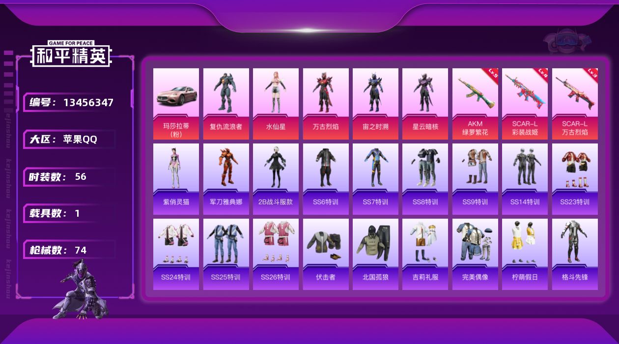 [13456347]【1523】苹果 手Q-5粉装-3特效枪-1载具-1粉色飞行器-23461热力值-3王牌印记-56套装-74枪皮