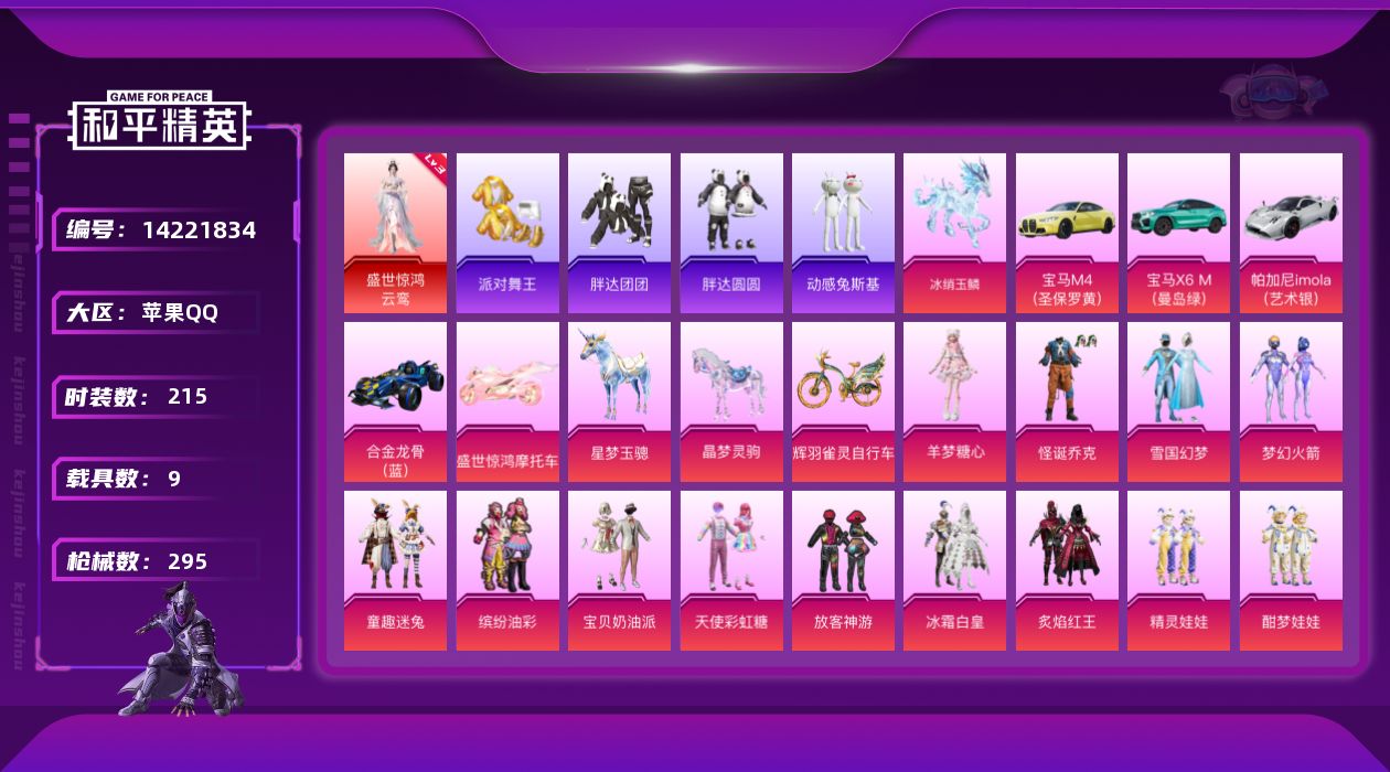 [14221834]【1588】苹果 手Q-无敌战神框-1神装-32粉装-25特效枪-9载具-16粉色飞行器-123352热力值-16王牌印记-215套装-295枪皮 【红色神装等级】:盛世惊鸿-云鸾(三级) 【红色角色神装】:盛世惊鸿-云鸾 【热门品类】:粉装-怪诞乔克,粉装-雪国幻梦,粉装-梦幻火箭,粉装-童趣迷兔,粉装-缤纷油彩,套装-派对舞王,套装-小丑鱼,角色-军刀雅典娜,套装-胖达团团,套装-胖达圆圆,套装-动感兔斯基人偶服,套装-龟仙人,套装-糯粉咩咩,套装-软软马卡龙,套装-红熊茄茄 【粉色载具】:宝马M4(圣保罗黄),宝马X6 M(曼岛绿),帕加尼imola(艺术银),合金龙骨(蓝),盛世惊鸿摩托车,僚机-圣域龙宝,星梦玉骢,晶梦灵驹,冰绡玉鳞,辉羽雀灵自行车 【粉色套装】:粉装-怪诞乔克,粉装-宝贝奶油派,粉装-天使彩虹糖,粉装-雪国幻梦,粉装-梦幻火箭,粉装-缤纷油彩,粉装-放客神游,粉装-冰霜白皇,粉装-童趣迷兔,粉装-炙焰红王,粉装-精灵娃娃,粉装-酣梦娃娃,粉装-岚岚物语,粉装-海盐物语,粉装-橘柚倾心,粉装-彩虹甜喵,粉装-冰川幽秘,粉装-仲夏莫吉托,角色-呆萌星弥,粉装-暖暖奶龙,角色-小叽联名款,角色-美雪,角色-美琪,角色-千金淑猫,角色-晶梦幻蝶,粉装-星月云朵,角色-智耀战神,粉装-星穹咏叹调,角色-狂魅哈莉,角色-荧海星豚,角色-奇迹舞步 美雪,角色-羊梦糖心 【粉色枪皮等级】:AKM-甜心宝贝(六级),AKM-绿萝繁花(五级),M16A4-垂柳戏鸭(一级),SCAR-L-梦幻火箭(七级),M416-心之恋语(五级),M416-女娲灵识(三级),GROZA-旋转彩虹(五级),AUG-星梦奇缘(六级),蜜獾-荧海星豚(二级),UMP45-宁雨蝶(三级),Vector-最终圣卫者(三级),P90-甜蜜草莓(五级),Kar98K-巳巳如意(五级),Kar98K-圣域龙灵(一级),Mini14-绚金瑰梦(四级),Mk14-盛世惊鸿(三级),AMR-智耀战神(五级),M200-伏羲圣卦(四级),DP-28-豹影疾电(五级),MG3-酷泡奶龙(二级),MG3-辉羽雀灵(一级),MG-36-沧焰双生(四级),平底锅-喜羊羊与灰太狼(二级),烟雾弹-丁香清露(四级),破片手榴弹-热量炸弹(六级) 【粉色枪皮】:AKM-甜心宝贝,AKM-绿萝繁花,M16A4-