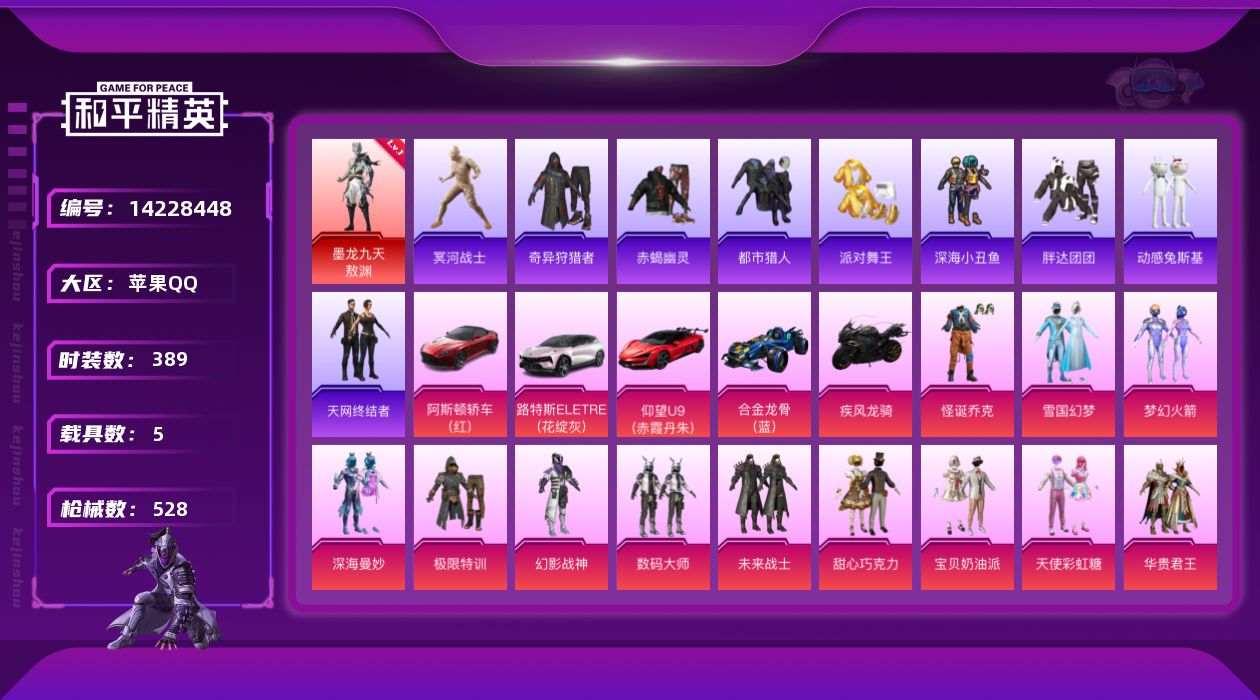 [14228448]【1593】苹果 手Q-无敌战神框-1神装-32粉装-27特效枪-5载具-9粉色飞行器-202246热力值-29王牌印记-389套装-528枪皮