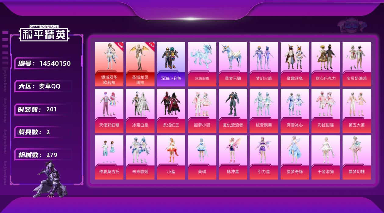 [14540150]【1626】安卓 手Q-2神装-22粉装-13特效枪-2载具-10粉色飞行器-107192热力值-10王牌印记-201套装-279枪皮