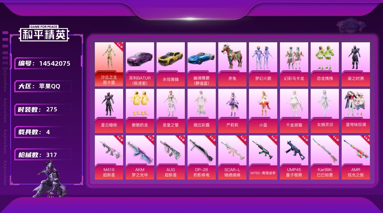 [14542075]【1630】苹果 手Q-1神装-13粉装-16特效枪-4载具-15粉色飞行器-120687热力值-21王牌印记-275套装-317枪皮 【红色神装等级】:沙丘之主-图卡盟(三级) 【红色角色神装】:沙丘之主-图卡盟 【热门品类】:粉装-梦幻火箭,套装-浪漫天命,套装-小丑鱼,角色-忠猛周仓,角色-忠真马岱,套装-龟仙人,套装-粉红小猪,角色-8号机,角色-Mark.06,角色-六号稻草人,大砍刀-青龙偃月刀,撬棍-龙胆亮银枪 【粉色载具】:宾利BATUR(极速紫),永恒黄蜂,幽澜尊爵(静谧蓝),赤兔 【粉色套装】:粉装-梦幻火箭,粉装-幻彩马卡龙,粉装-恐龙拽拽,角色-宙之时溯,角色-星云暗核,粉装-傲傲奶龙,角色-圣堂之誓,角色-烟云彩露,角色-严莉莉,角色-小蓝,角色-千金淑猫,角色-女娲灵识,粉装-星穹咏叹调 【粉色枪皮等级】:AKM-梦之光华(七级),SCAR-L-锦绣绵绵(五级),M416-风花雪月(一级),M416-超新星(九级),GROZA-精灵之光(三级),AUG-超新星(六级),M762-青锋波束(五级),UMP45-量子极限(五级),P90-沙丘之主(三级),Kar98K-巳巳如意(五级),M24-镜域双华(三级),Mk14-盛世惊鸿(三级),AMR-炫光之旅(五级),MK12-雪月幻音(三级),DP-28-豹影疾电(五级) 【粉色枪皮】:AKM-梦之光华,SCAR-L-锦绣绵绵,M416-风花雪月,M416-超新星,GROZA-精灵之光,AUG-超新星,M762-青锋波束,UMP45-量子极限,P90-沙丘之主,Kar98K-巳巳如意,M24-镜域双华,Mk14-盛世惊鸿,AMR-炫光之旅,MK12-雪月幻音,DP-28-豹影疾电,破片手榴弹-秋玉花灯 【粉色飞行器】:酣梦熊熊飞行器,萌物绒绒飞行器,超新星飞行器,万古烈焰飞行器,沙丘之主天马,镜域双华-灵镜之阶,绝色倾城飞行器,龙翔九天飞行器,深渊漩涡飞行器,幽焰列车飞行器,脆鲨七海飞行器,凤舞九天飞行器,赛博古神飞行器,极意拳锋飞行器 【粉色降落伞】:至尊龙雀降落伞,精灵迷巫降落伞,梦幻火箭降落伞,古堡领主降落伞,甜蜜誓约降落伞,星之彼岸降落伞,甜梦小狐降落伞,暗夜鎏金降落伞,第五大道降落伞,萌物绒绒降落伞,炫光之旅降落伞,莲影清波降落伞,圣堂之誓降落伞,沙丘之主降落伞,蜜语绒猫降落伞,镜