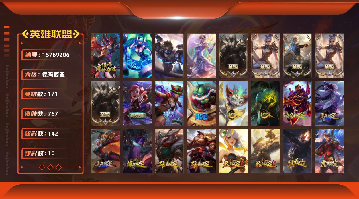 - [11900086]6神话 41限定 23传说 110史诗 404皮肤 111炫彩 171英雄 可二次 可修改实名 优质装备:黎明使者 卡尔玛,源代码 乐芙兰,防爆天使 凯尔,暗影 沃里克,都铎王朝 图奇,防爆士兵 炼金,冠军掠夺者 卡兹克,冠军之刃 锐雯 2016,红桃杰克 崔斯特,警用试作体K-9 内瑟斯,密林猎手 提莫,野兽猎人 泰达米尔,奥德赛 吉格斯,吕布 奉先 炫金战神,冠军之刃 锐雯 2016 凯旋圣装,天煞 劫 恒星游历者,无畏骑士 瑟庄妮 赤子初心,外星装甲 库奇,可爱可爱粉红红 布里茨,净雪之月 莫甘娜 冬虹,墨之影武者 亚索 金墨耀影,十五周年纪念 希维尔,魔女 阿卡丽 虚荣,暗裔英雄 盖伦 海克斯:海克斯 克格莫 限定:玉剑传说 舞龙卫 赛季限定皮:胜利凤凰 艾尼维亚,胜利之运 崔斯特,胜利剑圣 易,胜利女神 娑娜,胜利巨口 克格莫,胜利之王 泰达米尔,胜利女神 奥利安娜,胜利之剑 剑魔,胜利女神 瑟庄妮 冠军限定系列:S1FNC 酒桶,S1FNC 迦娜,S2 暗杀星 发条,S2 暗杀星 努努,S3 SKT T1 劫,S4 SSW 图奇 冰雪节限定:北极星典狱长 锤石,“主人不要我了” 阿木木,魄罗骑士 瑟庄妮,圣诞老人 酒桶,冰雪节 茂凯,雪装 奈德丽 泳池派对:海之歌 永恩 万圣节限定:鬼影重重 魔腾,南瓜头 费德提克 年限:点心宝贝 阿木木,天龙之子 斯莫德,猴年 孙悟空 周年:10周年 安妮,10周年 凤凰