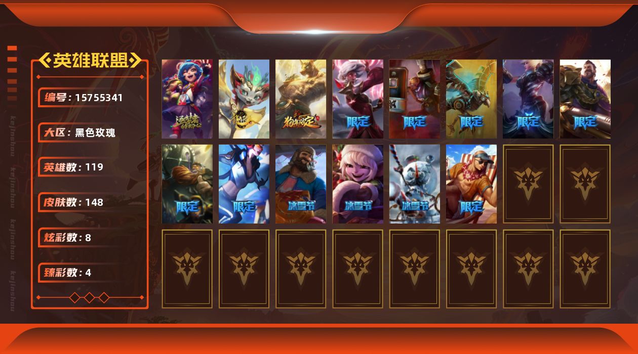 [15755341]可二次【特价出售/店主推荐】未定级段位-119英雄-148皮肤-8炫彩-0终极-1神话-16限定-20传说-38史诗