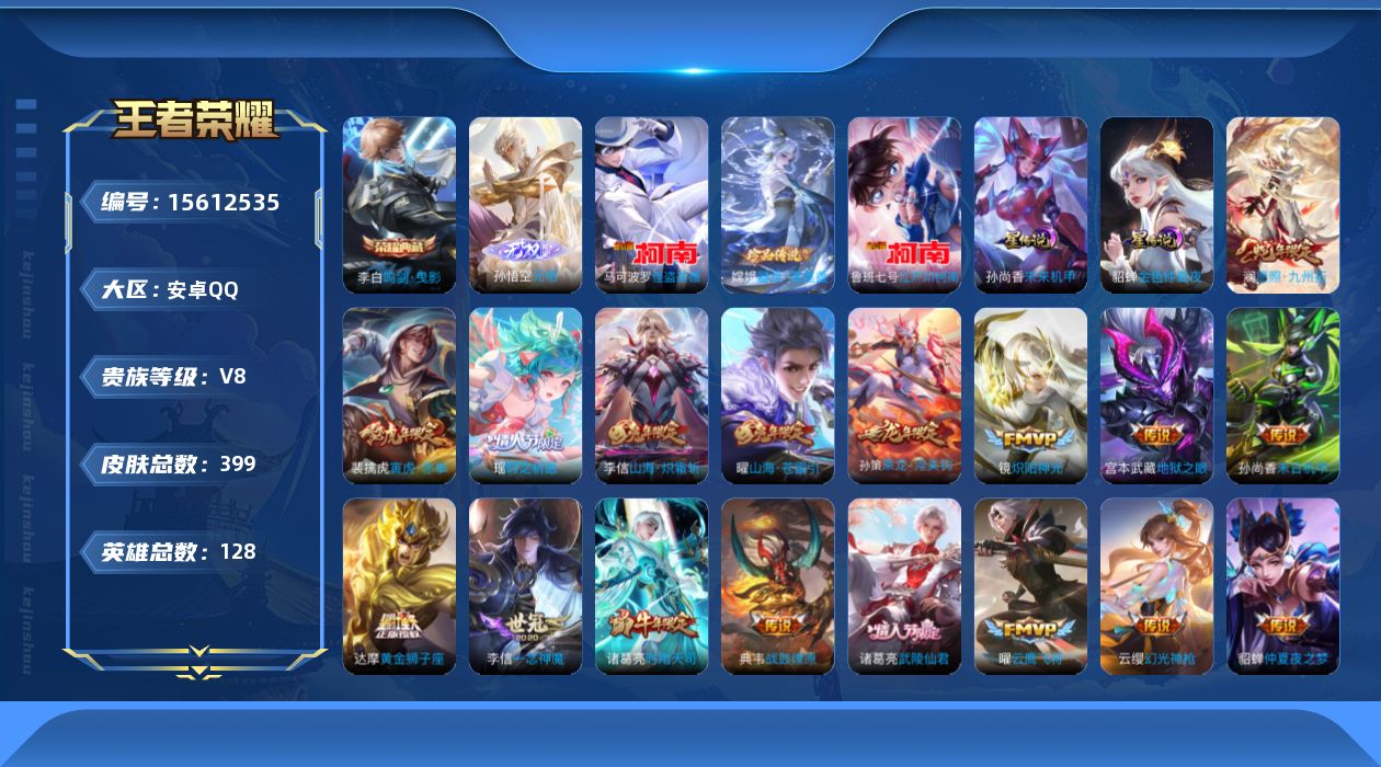 - [16325210]安卓Q-208皮肤-1典藏皮肤-3传说-41史诗 【荣耀典藏】:李白鸣剑曳影 【传说皮肤】:桑启鸣野蒿,后羿黄金射手座,李白凤求凰 【限定皮肤】:大乔绒语心约,姜子牙天穹之誓,杨戬破阵退雄兵,狄仁杰阴阳师,赵云皇家上将,孙尚香蔷薇恋人,夏侯惇朔风刀,曹操烛龙,典韦穷奇,马可波罗暗影游猎,狄仁杰魔术师,狄仁杰万华元夜,达摩沙漠行僧,项羽海滩派对,老夫子醍醐杖,关羽冰锋战神,程咬金演武夺筹,兰陵王金庭之子,孙悟空至尊宝,牛魔御旌,李元芳银河之约,李元芳云中旅人,钟馗神迹守卫,钟馗驱傩正仪,雅典娜单词大作战,雅典娜黎明之约,鬼谷子原初探秘者,鬼谷子五谷丰年,苏烈千军破阵,百里玄策原初追逐者,弈星混沌棋,梦奇顽趣,沈梦溪星空之诺,沈梦溪大漠名商,明世隐疑决卦,裴擒虎李小龙,裴擒虎擒涛扼浪,狂铁御狮,米莱狄御霄,云中君纤云弄巧,盾山御銮,猪八戒西部大镖客,上官婉儿梁祝,蒙犽狂想玩偶喵,鲁班大师探海日志,桑启海盐诗旅,艾琳女武神,张良古海寻踪,蒙恬荣光圣徽,鬼谷子天穹祈灯,刘邦剑破天穹,刘备异域游侠,周瑜熔金海岸 【年限皮肤】:李白凤求凰 【赛季限定】:夏侯惇朔风刀,曹操烛龙,典韦穷奇,狄仁杰万华元夜,达摩沙漠行僧,老夫子醍醐杖,程咬金演武夺筹,兰陵王金庭之子,张良古海寻踪,牛魔御旌,李元芳云中旅人,钟馗驱傩正仪,雅典娜黎明之约,鬼谷子原初探秘者,苏烈千军破阵,百里玄策原初追逐者,弈星混沌棋,梦奇顽趣,沈梦溪大漠名商,明世隐疑决卦,裴擒虎擒涛扼浪,狂铁御狮,米莱狄御霄,盾山御銮,鲁班大师探海日志,桑启海盐诗旅,鬼谷子天穹祈灯,蒙恬荣光圣徽,刘邦剑破天穹,姜子牙天穹之誓 【战令限定】:马可波罗暗影游猎,李元芳银河之约,钟馗神迹守卫,雅典娜单词大作战,沈梦溪星空之诺,猪八戒西部大镖客,蒙犽狂想玩偶喵 【史诗皮肤】:赵云皇家上将,貂蝉圣诞恋歌,甄姬冰雪圆舞曲,王昭君偶像歌手,狄仁杰魔术师,宫本武藏鬼剑武藏,孙尚香蔷薇恋人,孙尚香水果甜心,嬴政摇滚巨星,妲己魅力维加斯,墨子金属风暴,曹操幽灵船长,吕布末日机甲,韩信白龙吟,关羽冰锋战神,孙悟空至尊宝,花木兰水晶猎龙者,刘邦德古拉伯爵,夏侯惇乘风破浪,小乔缤纷独角兽,兰陵王暗隐猎兽者,诸葛亮黄金分割率,雅典娜冰冠公主,百里守约特工魅影,蔡文姬舞动绿茵,白起星夜王子,狄仁杰鹰眼统帅,上官婉儿梁祝,李元芳银河之约,不知火舞魅语,马可波罗暗影