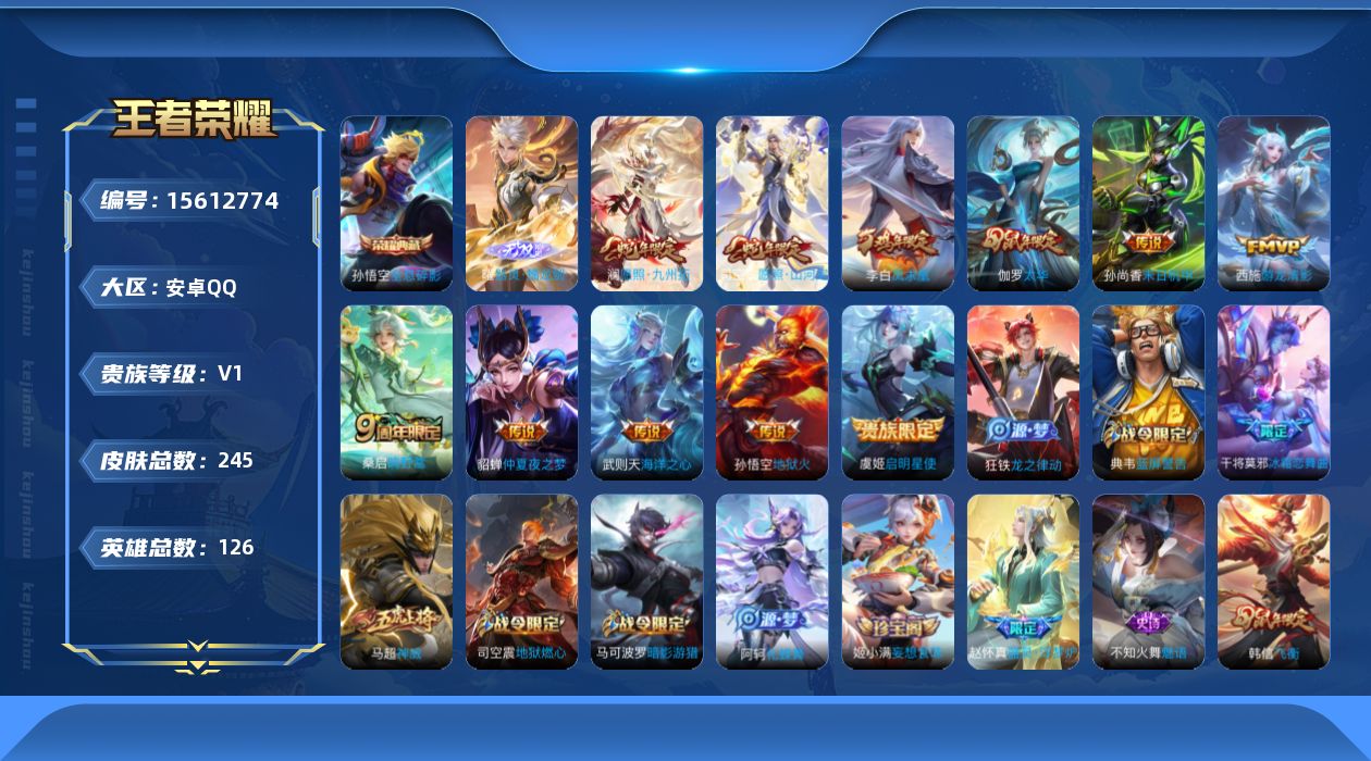 [15612774]可二次【店主推荐捡漏号!可直接换绑】安卓Q-V1-永恒钻石IV段位-126英雄-245皮肤-1典藏皮肤-1典藏英雄-1无双-12传说-75史诗