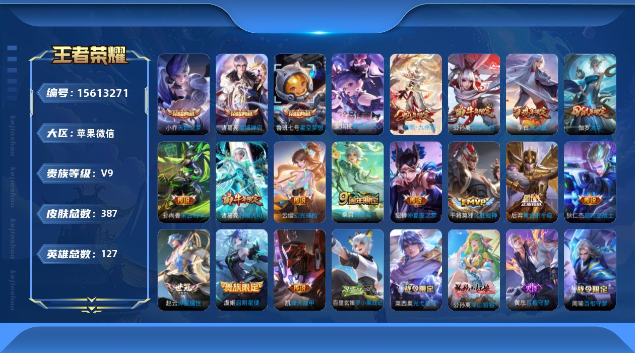 [15613271]苹果WX-V9-最强王者段位-127英雄-387皮肤-3典藏皮肤-1珍品传说-16传说-102史诗-5星传说 【英雄全皮】:孙权全皮,鬼谷子全皮,蒙恬全皮,莱西奥全皮,影全皮 【荣耀典藏】:小乔天鹅之梦,鲁班七号星空梦想,诸葛亮星域神启 【珍品传说】:安琪拉酷洛米之心 【传说皮肤】:后羿神树通天,澜愿照九州拓,云缨幻光神枪,桑启鸣野蒿,赵云淬星耀世,公孙离祈雪灵祝,诸葛亮时雨天司,铠绛天战甲,虞姬启明星使,伽罗太华,干将莫邪久胜战神,后羿黄金射手座,貂蝉仲夏夜之梦,李白凤求凰,孙尚香末日机甲,狄仁杰超时空战士 【限定皮肤】:白起狰,虞姬夏日便利店,姜子牙天穹之誓,狄仁杰阴阳师,虞姬凯尔特女王,赵云皇家上将,墨子神迹守卫,嬴政优雅恋人,嬴政白昼王子,鲁班七号乒乒小将,庄周高山流水,高渐离死亡摇滚,芈月重明,吕布猎兽之王,吕布御风骁将,元歌云间偶戏,夏侯惇朔风刀,甄姬游园惊梦,曹操烛龙,典韦穷奇,马可波罗暗影游猎,狄仁杰魔术师,狄仁杰万华元夜,达摩沙漠行僧,项羽海滩派对,老夫子醍醐杖,老夫子航海奇遇记,程咬金演武夺筹,兰陵王金庭之子,亚瑟潮玩骑士王,孙悟空美猴王,孙悟空至尊宝,孙悟空大圣娶亲,孙悟空孙行者,后羿辉光之辰,后羿如梦令,后羿圣弓游侠,李元芳银河之约,李元芳云中旅人,虞姬启明星使,钟馗驱傩正仪,杨玉环遇见飞天,杨戬潮玩骑兵,女娲朔望之晖,干将莫邪冰霜恋舞曲,干将莫邪真爱魔法,雅典娜单词大作战,雅典娜黎明之约,蔡文姬繁星吟游,太乙真人饕餮,鬼谷子原初探秘者,鬼谷子五谷丰年,诸葛亮时雨天司,苏烈千军破阵,百里玄策原初追逐者,百里守约朱雀志,弈星混沌棋,梦奇顽趣,公孙离祈雪灵祝,沈梦溪星空之诺,沈梦溪大漠名商,明世隐疑决卦,裴擒虎李小龙,裴擒虎擒涛扼浪,狂铁御狮,米莱狄御霄,云中君纤云弄巧,伽罗太华,盾山御銮,猪八戒西部大镖客,上官婉儿梁祝,蒙犽狂想玩偶喵,鲁班大师探海日志,桑启海盐诗旅,艾琳女武神,阿古朵江河有灵,张良古海寻踪,蒙犽百解令,蒙恬荣光圣徽,高渐离燃音魔法,妲己灵卜魔法,鬼谷子天穹祈灯,伽罗琥珀纪元,沈梦溪龙舞盛年,鲁班七号蔬乡物语,李元芳蔬乡物语,刘邦剑破天穹,程咬金群星魔术团,镜青焰无极,项羽苍威无极,刘备异域游侠,芈月浮光幕影,周瑜熔金海岸 【年限皮肤】:百里守约朱雀志,孙悟空美猴王,李白凤求凰,后羿辉光之辰,公孙离祈雪灵祝,吕布御风骁将,诸葛