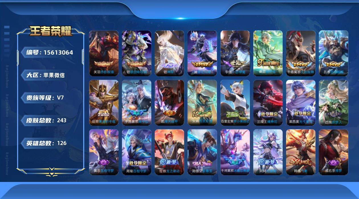 [15613064]苹果WX-V7-最强王者段位-126英雄-243皮肤-2典藏皮肤-1无双-10传说-68史诗