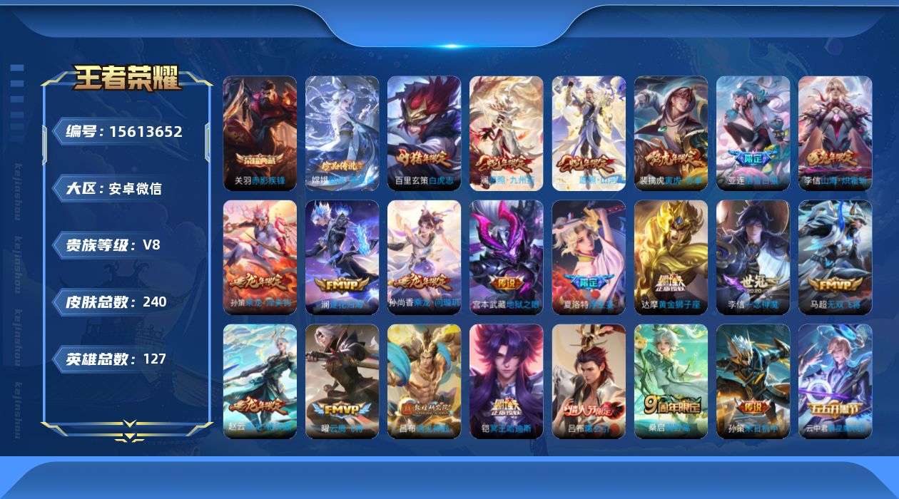 [15613652]社交限制-介意勿拍-安卓WX-V8-最强王者段位-127英雄-240皮肤-1典藏皮肤-1珍品传说-29传说-82史诗