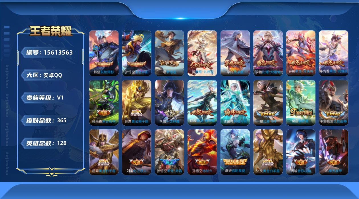 [15613563]可二次【店主推荐捡漏号!可直接换绑】安卓Q-V1-永恒钻石V段位-127英雄-365皮肤-2典藏皮肤-23传说-109史诗 【英雄全皮】:刘邦全皮,孙权全皮,李信全皮,猪八戒全皮 【荣耀典藏】:孙悟空全息碎影,韩信弑枪猎影 【传说皮肤】:后羿神树通天,澜愿照九州拓,桑启鸣野蒿,孙尚香乘龙问璇玑,孙策乘龙淬吴钩,赵云乘龙铭钟鼎,李信山海炽霜斩,曜李逍遥 ,周瑜音你心动,诸葛亮时雨天司,铠绛天战甲,虞姬启明星使,孙悟空零号赤焰,曜云鹰飞将,李信一念神魔,刘备时之恋人,张良黄金白羊座,干将莫邪久胜战神,达摩黄金狮子座,后羿黄金射手座,李白凤求凰,孙尚香末日机甲,孙悟空地狱火 【限定皮肤】:姜子牙天穹之誓,狄仁杰阴阳师,赵云皇家上将,赵云龙胆,嬴政优雅恋人,嬴政白昼王子,孙尚香蔷薇恋人,鲁班七号狮舞东方,庄周高山流水,高渐离死亡摇滚,阿轲迷踪丽影,孙膑天狼运算者,白起夜都怪侠,芈月白晶晶,吕布猎兽之王,周瑜赤莲之焰,元歌云间偶戏,元歌无心,夏侯惇朔风刀,甄姬游园惊梦,曹操天狼征服者,典韦蓝屏警告,典韦岱宗,马可波罗暗影游猎,狄仁杰魔术师,狄仁杰万华元夜,达摩星际陆战队,达摩沙漠行僧,项羽海滩派对,老夫子醍醐杖,程咬金演武夺筹,刘邦夺宝奇兵,韩信飞衡,韩信傲雪梅枪,王昭君午后时光,兰陵王驯魔猎人,兰陵王金庭之子,花木兰默契交锋,亚瑟潮玩骑士王,孙悟空至尊宝,孙悟空大圣娶亲,孙悟空零号赤焰,孙悟空孙行者,牛魔御旌,牛魔奔雷神使,后羿辉光之辰,后羿如梦令,张飞虎魄,李元芳银河之约,李元芳云中旅人,虞姬启明星使,钟馗神迹守卫,钟馗驱傩正仪,女娲朔望之晖,雅典娜单词大作战,雅典娜黎明之约,蔡文姬繁星吟游,鬼谷子原初探秘者,鬼谷子五谷丰年,诸葛亮时雨天司,铠青龙志,苏烈千军破阵,弈星混沌棋,梦奇顽趣,沈梦溪星空之诺,沈梦溪大漠名商,明世隐疑决卦,明世隐吟游魔法,裴擒虎李小龙,裴擒虎擒涛扼浪,狂铁电玩高手,米莱狄御霄,米莱狄胡桃异想国,云中君纤云弄巧,李信山海炽霜斩,盾山御銮,猪八戒西部大镖客,猪八戒猪悟能,上官婉儿梁祝,嫦娥拒霜思,曜李逍遥 ,蒙犽狂想玩偶喵,鲁班大师探海日志,桑启海盐诗旅,阿古朵江河有灵,张良古海寻踪,蒙犽百解令,高渐离燃音魔法,妲己灵卜魔法,鬼谷子天穹祈灯,伽罗琥珀纪元,姬小满妄想食味,孙尚香乘龙问璇玑,孙策乘龙淬吴钩,赵云乘龙铭钟鼎,沈梦溪龙舞盛年,鲁班七号蔬乡