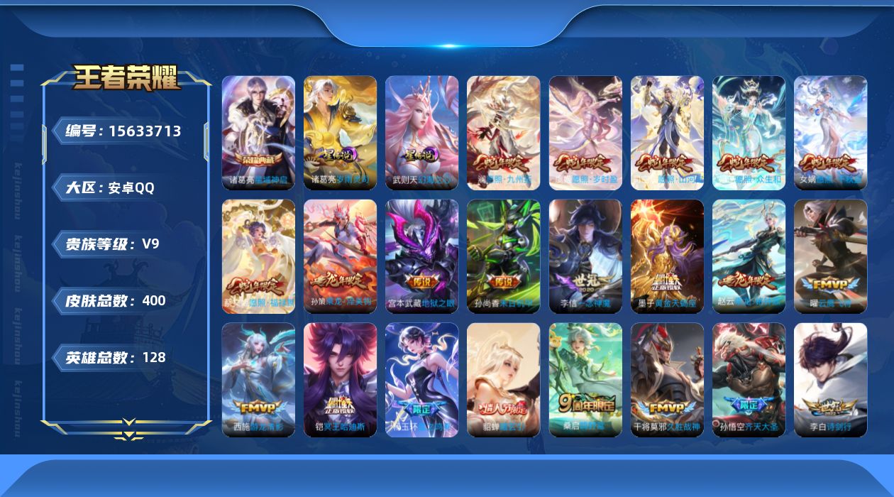 [15633713]安卓Q-V9-荣耀黄金I段位-128英雄-400皮肤-1典藏皮肤-1典藏英雄-34传说-111史诗-2星传