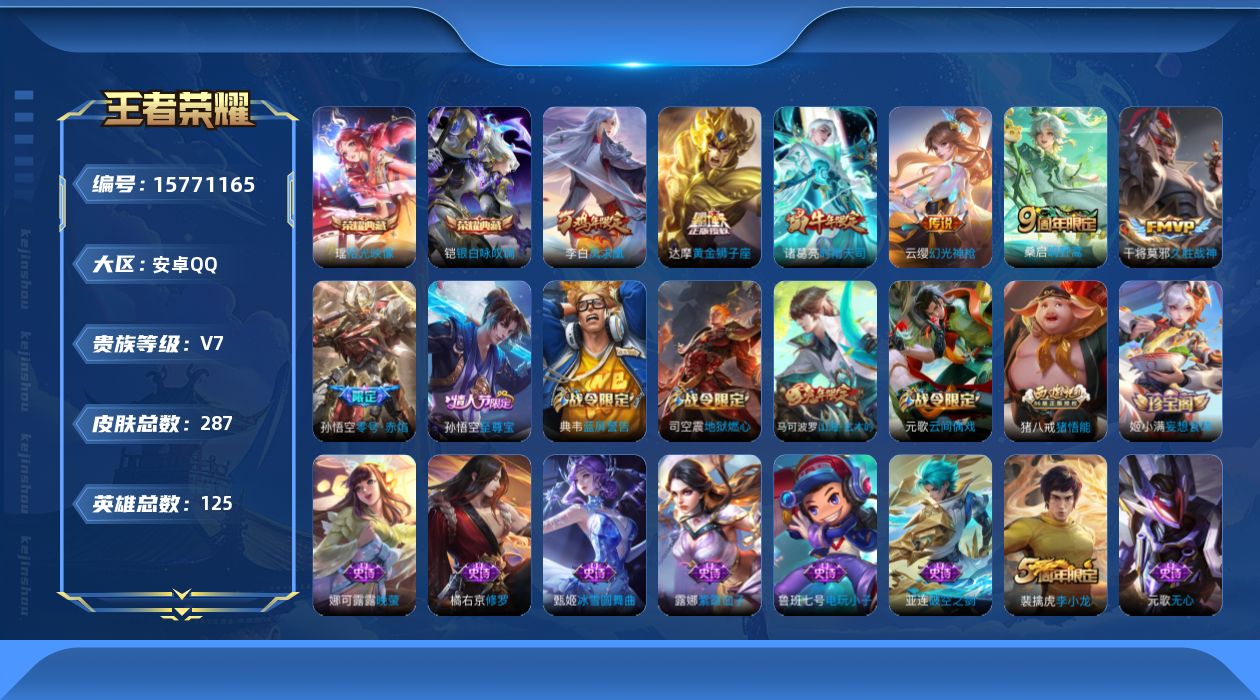 [15771165]【店主推荐捡漏号!可直接换绑】安卓Q-V7-最强王者段位-125英雄-287皮肤-2典藏-7传说-79史诗