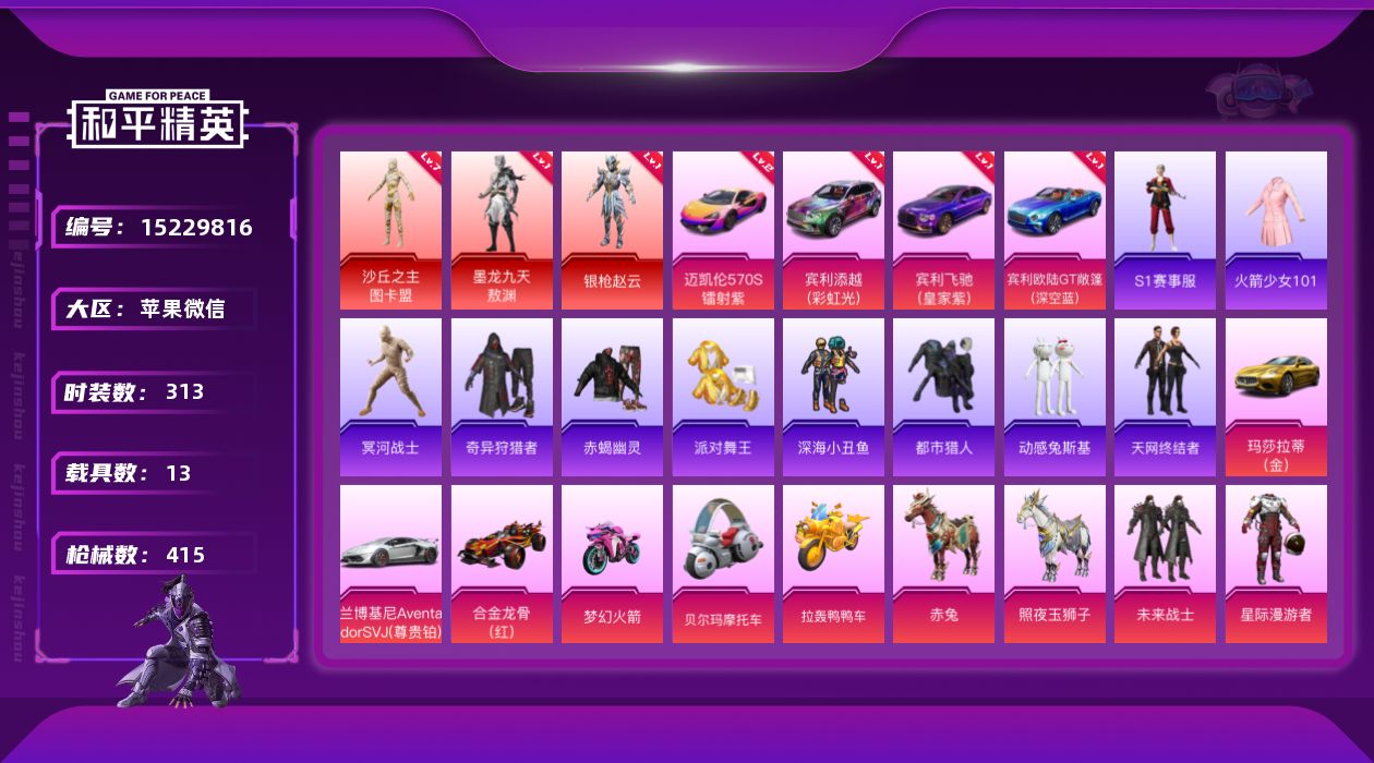 [15229816]极品明星ID:林更新 满级图卡盟=老101+s1全套苹果 微信-3红装-40粉装-25特效枪-12载具-209370热力值-28印记-313套装-415枪皮 【角色神装】:墨龙九天-敖渊,沙丘之主-图卡盟,角色-银枪赵云 【角色神装等级】:墨龙九天-敖渊(一级),沙丘之主-图卡盟(七级),角色-银枪赵云(一级) 【稀有载具】:兰博基尼Aventador SVJ(尊享铂),玛莎拉蒂Ghibli(金),宾利欧陆GT敞篷(深空蓝),宾利飞驰(皇家紫),宾利添越(彩虹光),迈凯伦570S(镭射紫),合金龙骨(红),双人摩托-梦幻火箭,布尔玛摩托车,拉轰鸭鸭车,空客H135-恋语之翼,赤兔,照夜玉狮子 【稀有载具等级】:迈凯伦570S(镭射紫)(二级),宾利添越(彩虹光)(一级),宾利飞驰(皇家紫)(一级),宾利欧陆GT敞篷(深空蓝)(一级) 【特效枪等级】:AKM-炫紫旋律(一级),AKM-星际浪客(一级),AKM-盖世英雄(九级),SCAR-L-桃夭倾城(一级),SCAR-L-天蓬元帅(九级),SCAR-L-纯梦嫁纱(五级),M416-五爪金龙(七级),M416-心之恋语(一级),M416-墨龙九天(三级),GROZA-旋转彩虹(五级),AUG-星之彼岸(六级),M762-甜蜜誓约(一级),M762-甜心娃娃(七级),UMP45-雪国精灵(七级),AKS-74U-星穹咏叹调(四级),P90-甜蜜草莓(五级),P90-沙丘之主(三级),Kar98K-巳巳如意(三级),M24-星之信仰(五级),AWM-橘柚倾心(四级),SPAS-12-音爆索尼克(七级),DP-28-圣堂之誓(一级),MG3-洛神天依(一级),MG3-酷泡奶龙(七级),破片手榴弹-瓶中星球(七级) 【优质套装】:粉装-未来战士,粉装-星际漫游者,粉装-怪诞乔克,粉装-甜心巧克力,粉装-宝贝奶油派,粉装-天使彩虹糖,粉装-雪国幻梦,粉装-蝶舞迷情,粉装-梦幻火箭,粉装-金风玉露,粉装-缤纷油彩,粉装-放客神游,粉装-天禅智恒,粉装-向日葵,粉装-绚金战神,粉装-星之彼岸,角色-洛天依,角色-2号机款机体服,粉装-蓝莓炮弹,粉装-精灵娃娃,粉装-甜蜜草莓,粉装-旋转彩虹,粉装-冰川粉黛,粉装-冰川幽秘,粉装-冰川红玫,粉装-桃夭倾城,粉装-碧穹智者,粉装-光明术士,粉装-启明星,粉装-暗夜鎏金,粉装-音爆索尼克