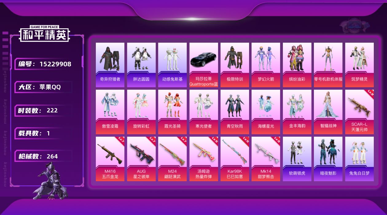 [15229908]连体王者v8/248皮肤8/12传说/1无双/地铁满天赋/SCAR-L-天蓬元帅(九级)【暑期末清货/特价急出/永久包赔】:苹果 手Q-13粉装-7特效枪-1载具-9.5w热力值-10印记-222套装-264枪皮【热门品类】:套装-奇异狩猎者,套装-胖达圆圆,套装-动感兔斯基人偶服【稀有载具】:玛莎拉蒂Quattroporte(夜幕蓝)【特效枪等级】:SCAR-L-天蓬元帅(九级),M416-五爪金龙(七级),AUG-星之彼岸(七级),汤姆逊-热量炸弹(五级),Kar98K-巳巳如意(五级),M24-翩跹演武(七级),MG3-辉羽雀灵(五级Mk14-甜梦熊击)【优质套装】:粉装-极限特训,粉装-梦幻火箭,粉装-缤纷油彩,角色-零号机款机体服,粉装-筑梦精灵,粉装-傲雪凌霜,粉装-旋转彩虹,粉装-霞光圣骑,粉装-寒光使者,粉装-青空秋雨,粉装-海螺星光,粉装-金丰海韵,角色-智耀战神【优质飞行器】:星夜魔法师飞行翼,圣域金龙飞行器