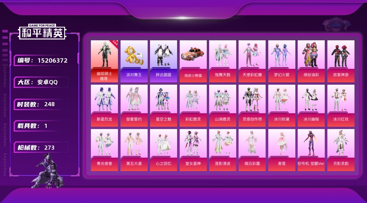 [15206372]【暑期末清货/特价急出/永久包赔】:安卓 手Q-1红装-25粉装-10特效枪-1载具-10.8w热力值-15印记-248套装-273枪皮【热门品类】:套装-派对舞王,套装-胖达圆圆【角色神装等级】:幽焰骑士-维塔(一级)【稀有载具】:俏皮小熊猫【特效枪等级】:SCAR-L-锦绣绵绵(五级),M416-五爪金龙(七级),M416-墨龙九天(三级),UMP45-量子极限(五级),汤姆逊-冰川粉黛(六级),Kar98K-巳巳如意(五级),Mk14-精灵梦叶罗丽(六级),SPAS-12-蜜语绒猫(四级),MG3-洛神天依(五级),烟雾弹-丁香清露(五级)【优质套装】:粉装-独舞天鹅,粉装-天使彩虹糖,粉装-梦幻火箭,粉装-缤纷油彩,粉装-放客神游,粉装-新星烈龙,粉装-甜蜜誓约,粉装-星空之魅,粉装-彩虹鹿灵,粉装-山涧鹿灵,粉装-灵感创作师,粉装-冰川粉黛,粉装-冰川幽秘,粉装-冰川红玫,粉装-寒光使者,粉装-第五大道,粉装-心之回忆,粉装-室女星神,粉装-莲影清波,角色-烟云彩露,角色-美雪,角色-初号机 觉醒Ver.,角色-月影灵韵,粉装-幻彩电音,角色-绯月迷踪【优质飞行器】:镜域双华-灵镜之阶,龙翔九天飞行器,雀灵庇佑飞行器,幻星舰长飞行器