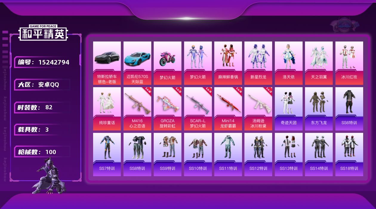 [15242794]【暑期末清货/特价急出/永久包赔】:安卓 手Q-7粉装-5特效枪-3载具-3.9w热力值-1印记-82套装-100枪皮【稀有载具】:特斯拉Model 3(冷光银),迈凯伦570S(天际蓝),双人摩托-梦幻火箭【特效枪等级】:SCAR-L-梦幻火箭(四级),M416-心之恋语(六级),GROZA-旋转彩虹(五级),汤姆逊-冰川粉黛(三级),Mini14-龙虾霸霸(四级)【优质套装】:粉装-梦幻火箭,粉装-麻辣鲜香锅,粉装-新星烈龙,角色-洛天依,粉装-天之羽翼,粉装-冰川红玫,粉装-纯珍童话【优质飞行器】:梦幻火箭飞行器,天之羽翼飞行器