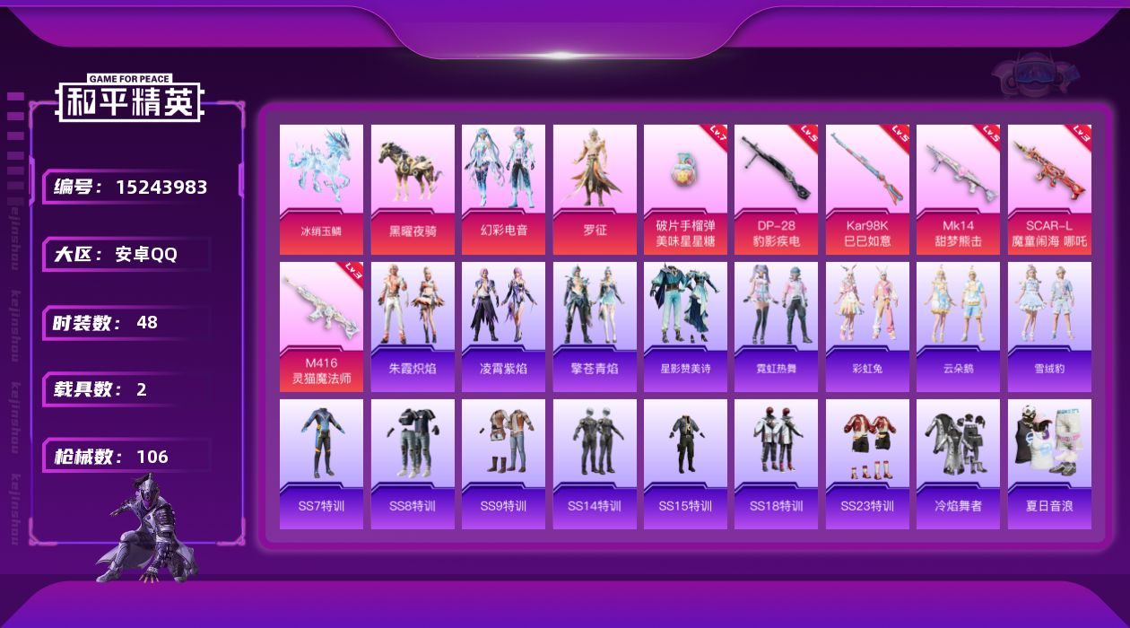 - [12587831]安卓 手Q-8粉装-4特效枪-1载具-1粉色飞行器-73110热力值-8王牌印记-145套装-212枪皮 【热门品类】:套装-浪漫天命,套装-动感兔斯基人偶服,角色-2B战斗服款,套装-龟仙人 【粉色载具】:鬼马风驰 【粉色套装】:粉装-草莓生巧,粉装-蜜桃特工,粉装-蝶舞蔷薇,粉装-碧影闪光,粉装-旋转彩虹,粉装-飒粉甜心,粉装-炎氏战神,角色-猩猩队长 【粉色枪皮等级】:AKM-炫紫旋律(七级),SCAR-L-童趣迷兔(七级),DP-28-枪炮玫瑰(七级),DP-28-暗夜鎏金(六级) 【粉色枪皮】:AKM-炫紫旋律,SCAR-L-童趣迷兔,DP-28-枪炮玫瑰,DP-28-暗夜鎏金 【粉色飞行器】:终极赛罗飞行器 【粉色降落伞】:深海曼妙降落伞,快乐主宰降落伞,潮汐统领降落伞,夏日绵绵冰降落伞,银刃赛罗降落伞,童趣迷兔降落伞,烈焰拳霸降落伞,枪炮玫瑰降落伞,林间仙鹿降落伞,蓝莓炮弹降落伞,妙趣可丽降落伞,旋转彩虹降落伞,音爆索尼克降落伞,未来歌姬降落伞,拂晓神骑降落伞 【稀有套装】:套装-龟仙人 【稀有枪皮】:AKM-夜灯,AKM-彩虹符号,AKM-恐龙拽拽,AKM-灼热熔岩,AKM-环太平洋,AKM-百万伏特,AKM-萌趣颜团子,AKM-虎虎生威,AKM-霓虹街区,AKM-龙的传人,M16A4-夜灯,M16A4-幻世战舞者,M16A4-机械英豪,M16A4-甜心亚梦,SCAR-L-夜灯,SCAR-L-炫彩节奏,SCAR-L-玉兔迎春,SCAR-L-甜蜜旋律,SCAR-L-青丘仙客,SCAR-L-龙宫之主,M416-夜灯,M416-神秘黑猫,M416-糯团青竹,GROZA-2B战斗服款,GROZA-异彩先驱,GROZA-彩虹符号,GROZA-懵萌河马,GROZA-治愈之星,GROZA-生命誓言,GROZA-田园牧歌,GROZA-马卡龙,AUG-流星咚咚,AUG-青春冒险家,QBZ-原初圣火,QBZ-妙趣可丽,QBZ-彩虹符号,QBZ-未来歌姬,QBZ-洛神天依,QBZ-电玩视界,QBZ-神秘黑猫,QBZ-赛罗,QBZ-飞驰魅影,M762-天降萌叽,M762-暗夜鎏金,M762-烈焰拳霸,M762-牛气冲天,M762-瑞龙福将,M762-镭射皇者,Mk47-妙红点点,Mk47-百万伏特,Mk47-青春冒险家,G36C-不夜海上花,G36C-懵萌河马,G36C-